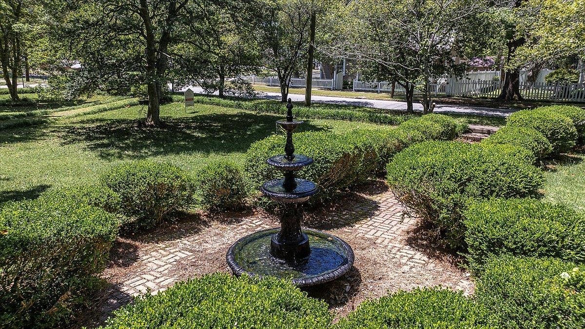 A stately historic home is centered at the end of a brick pathway lined with manicured hedges, leading up to a classic two-story facade. The exterior features crisp white siding and black shutters, with a wide front porch bordered by slender columns and decorative railings. Above the main entrance is a small balcony, and tall windows display delicate white grilles. The home is framed by lush, mature trees and dense landscaping that provide shade and privacy. At the pathway’s midpoint stands a tiered cast iron fountain, anchoring the symmetrical approach and enhancing the home’s elegant, timeless appeal.