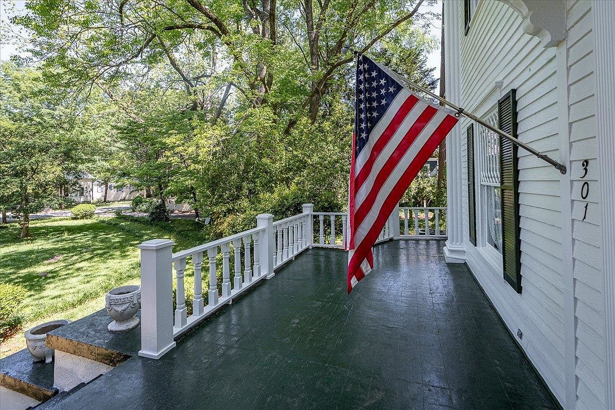 The front porch features a classic American aesthetic, highlighted by a large flag mounted near the entrance. The porch floor is painted a dark green, contrasting with the bright white railing and trim. Vertical balusters line the perimeter, adding to the historic charm. A pair of decorative urns sit on brick pedestals at the porch steps, offering subtle ornamentation. The house exterior is white with black shutters flanking large sash windows, and the street number ‘301’ is visible beside the door. Lush green lawn and mature trees create a peaceful, shaded atmosphere beyond the porch railing.