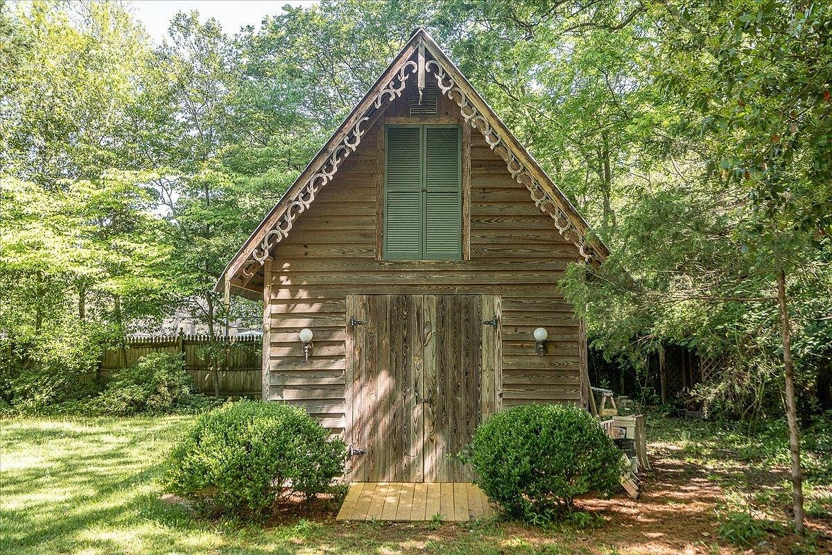 A rustic wooden outbuilding is centered within a green, tree-filled yard. The structure has weathered wood siding, a steeply pitched roof, and decorative trim along the eaves. Double barn-style doors are framed by two vintage wall lanterns. Above the doors, green shutters are closed over a small upper window. Symmetrical bushes frame the entrance, and a narrow wooden step leads up to the door. Dappled sunlight filters through mature trees, casting soft shadows and creating a peaceful, secluded atmosphere. The setting suggests rural charm and historical character, with the aged wood blending harmoniously into the surrounding landscape.