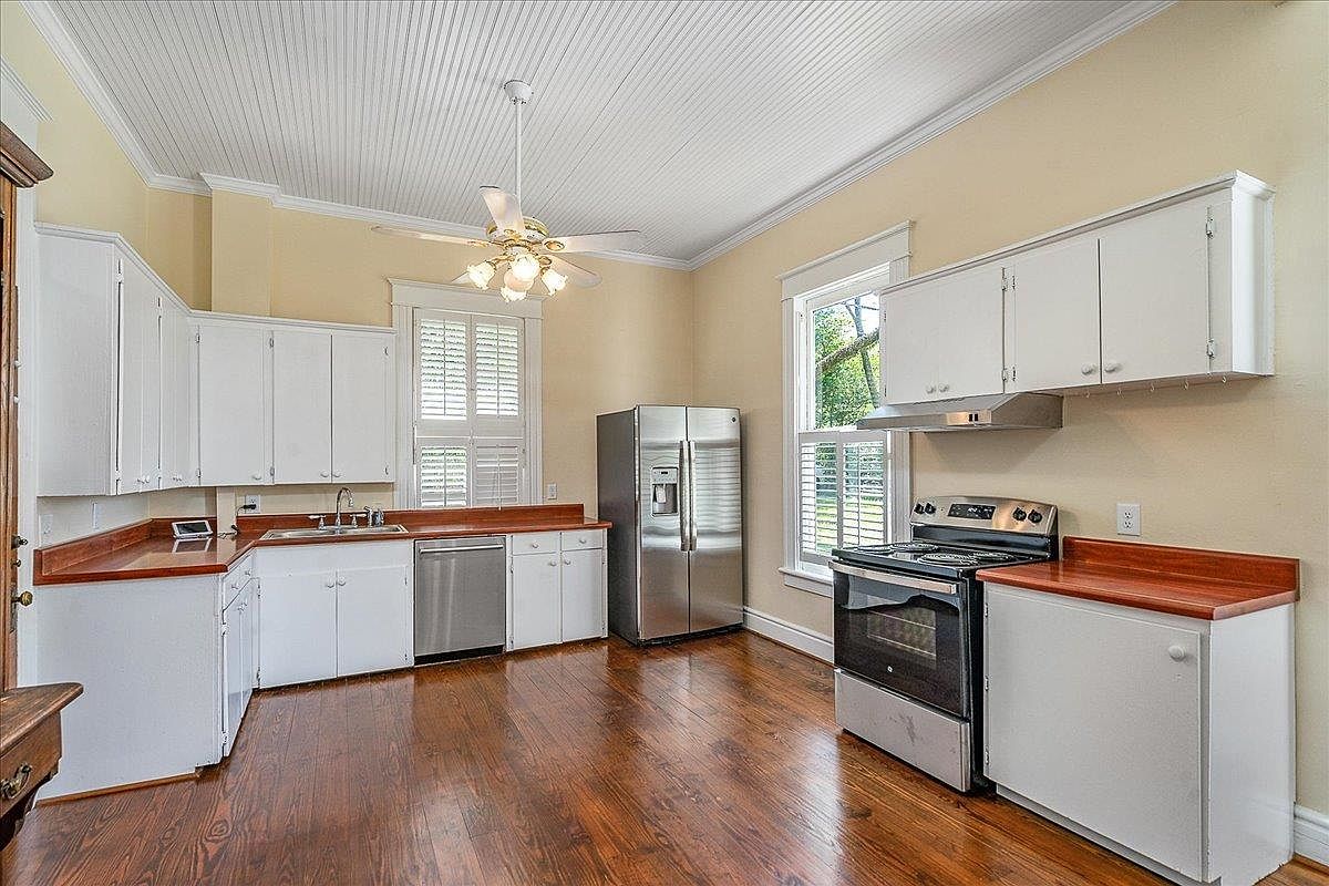 Spacious kitchen with a high beadboard ceiling painted white, adding to the light, airy feeling. Warm-toned wooden floors contrast with crisp white cabinetry lining two walls, including upper cabinets for ample storage. The countertops have a reddish-brown hue and appear sturdy and practical. Stainless steel appliances, including a double-door refrigerator, dishwasher, and a modern oven with a hood, add a contemporary touch to the historic design. Large windows with classic trim and plantation shutters let in natural light. The room feels open due to the tall ceilings, neutral beige walls, and the central ceiling fan with chandelier lighting.
