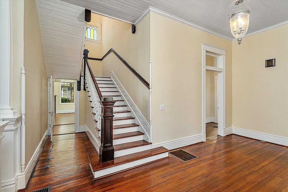 A warm-toned hallway features rich wooden floors that gleam with a polished finish, complemented by cream-colored walls and crisp white trim. A central staircase commands attention, with dark wooden railings, newel post, and white risers adding a stately contrast. High ceilings with beadboard paneling create a sense of spaciousness and traditional charm. To the left and right are wide doorways framed in white, leading to adjacent rooms. A glass pendant lantern hangs above, providing elegant illumination. At the top of the stairs, a window with stained glass accents filters soft light, enhancing the historic character of the space.