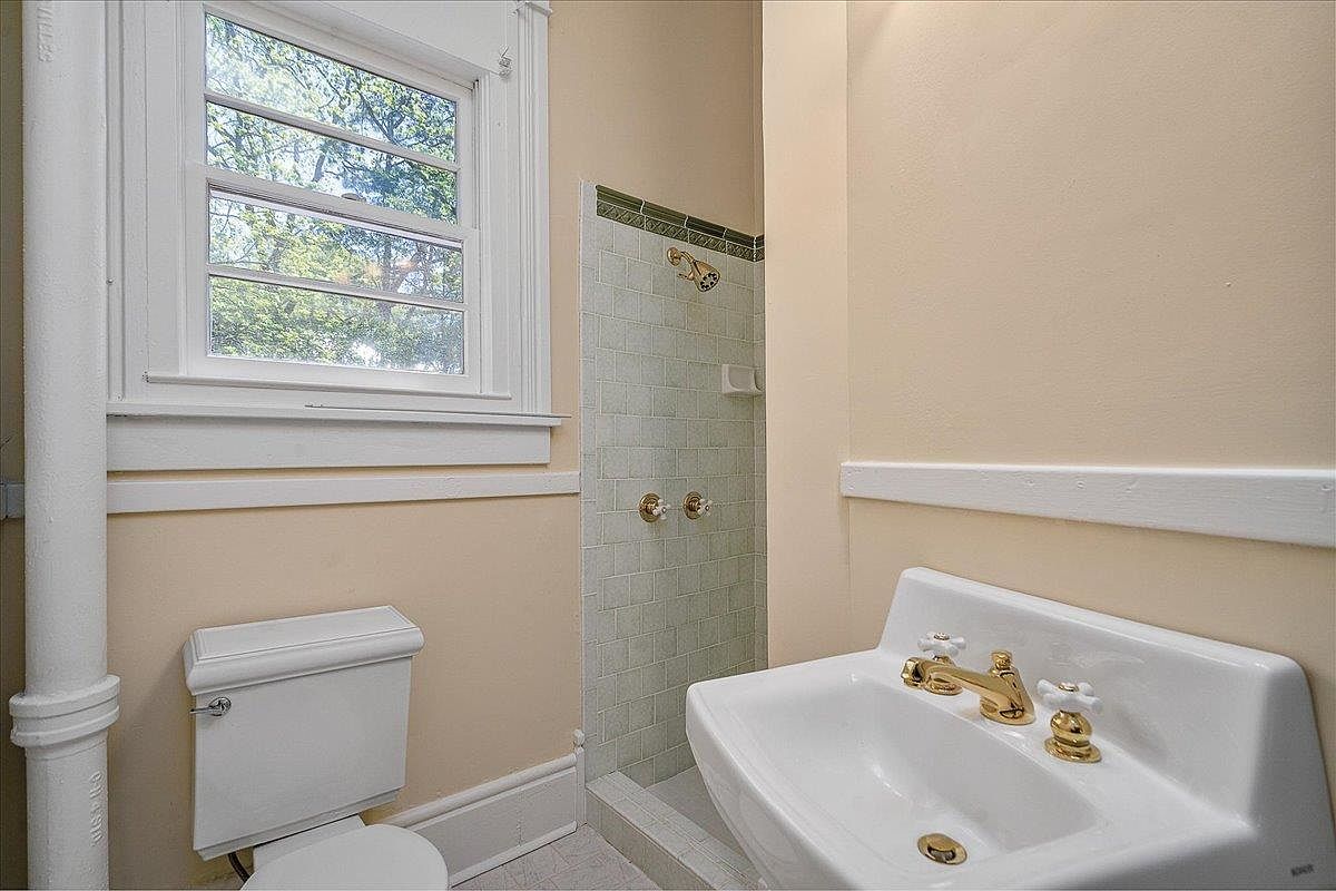 This compact bathroom features a soft beige color scheme on the walls, accented by white trim and fixtures. A white porcelain toilet sits beneath a large window framed with classic molding, allowing abundant natural light to fill the space. The vanity includes a vintage-inspired white porcelain sink with polished brass hardware, offering both character and shine. Adjacent to the sink, a small walk-in shower is finished with pale green subway tiles and topped with a slender emerald green tile border, adding subtle color and period style. The bathroom combines practicality with thoughtful historic touches, creating a cozy, light-filled atmosphere.