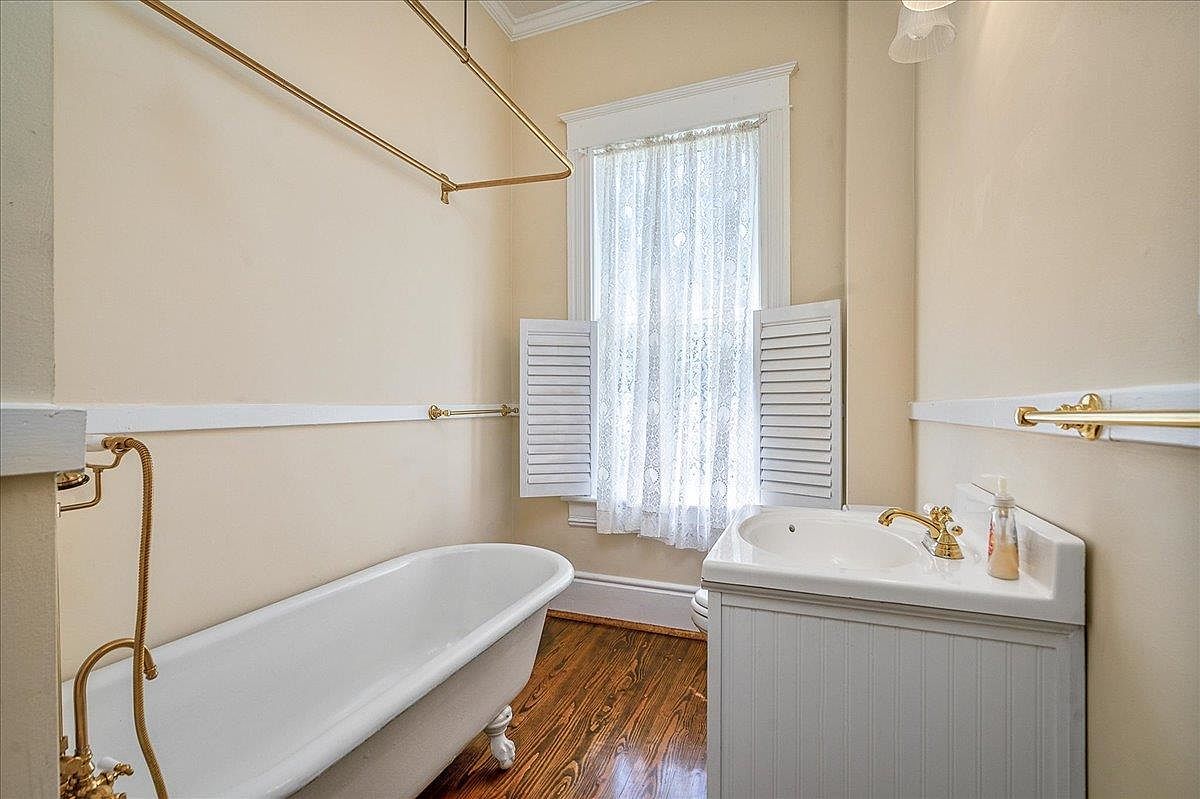 A classic bathroom showcasing a clawfoot soaking tub with brass fittings and overhead shower rod on the left. Cream-colored walls and bright white trim create a soft, airy vibe. A single window with lace curtains and white plantation shutters lets in filtered daylight, framed by wide, vintage-style molding. The white vanity features beadboard paneling and a gold faucet, matching the towel bars for a cohesive look. Rich, polished hardwood floors lend warmth to the space. The tall ceiling enhances the room’s sense of openness, and the entire area feels nostalgic yet clean and welcoming.