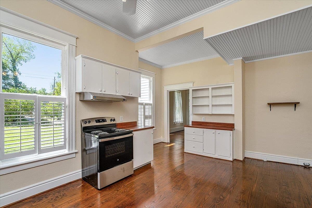 This space features a bright, airy kitchen with large windows framed by classic white trim, allowing natural light to flood the room. Walls are painted a warm beige, complementing the gleaming medium-brown hardwood floors. White cabinetry lines the wall, paired with wood-toned countertops, lending a timeless, vintage feel. A stainless steel electric stove sits beneath a simple vent hood, and open shelving on one wall allows for both storage and display. The ceiling displays beadboard paneling painted a soft gray, adding character and texture. Fresh, uncluttered, and inviting, this room blends traditional charm with practical design.