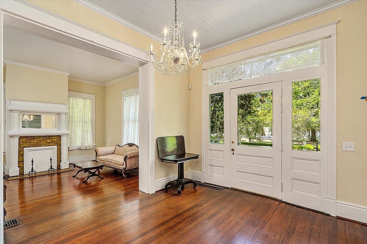Tall ceilings and large, paned windows brighten this entryway, which features a grand white front door flanked by sidelights and a transom with lace curtains. Warm honey-toned hardwood floors run throughout, complemented by creamy pale yellow walls and crisp white crown molding. A sparkling crystal chandelier hangs overhead, adding a touch of elegance. The space opens into a parlor with a vintage settee, small wooden coffee table, and an ornate white fireplace with golden-brick tilework. Large, sheer-curtained windows flood the room with natural light, highlighting the blend of historic charm and understated sophistication.