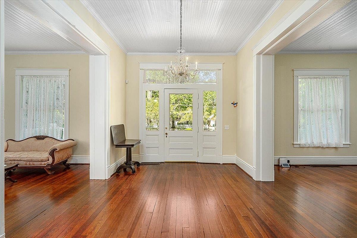 Bright entryway with gleaming polished hardwood floors and soft cream-colored walls, creating a welcoming atmosphere. The white double front doors feature a large transom window above, allowing natural light to fill the space. A delicate crystal chandelier hangs from the beadboard ceiling, adding an elegant touch. Ornate trim frames the doors and nearby windows, all dressed with lace curtains. A vintage side chair and table are placed against one wall, while the adjacent sitting room, partially visible, holds a classic upholstered settee, showcasing period details and understated sophistication in this historic home.