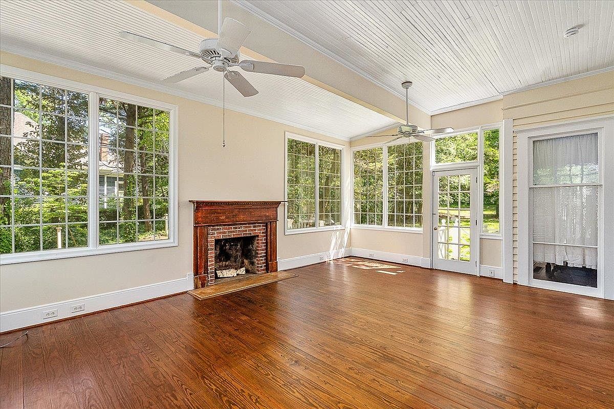 A large sunroom filled with natural light from three walls of tall grid windows, offering expansive views of lush greenery outside. The room features lustrous medium-toned wood floors and a classic brick fireplace with a dark wood mantel, creating a cozy focal point. The ceiling is painted white with a beadboard finish, accentuated by exposed beams and two white ceiling fans for airflow. Soft cream-colored walls provide a warm, neutral backdrop. Glass-paneled doors open out to the garden, while an adjacent interior door with sheer curtains maintains privacy. The room feels open, airy, and inviting, blending historic character with tranquil, natural surroundings.