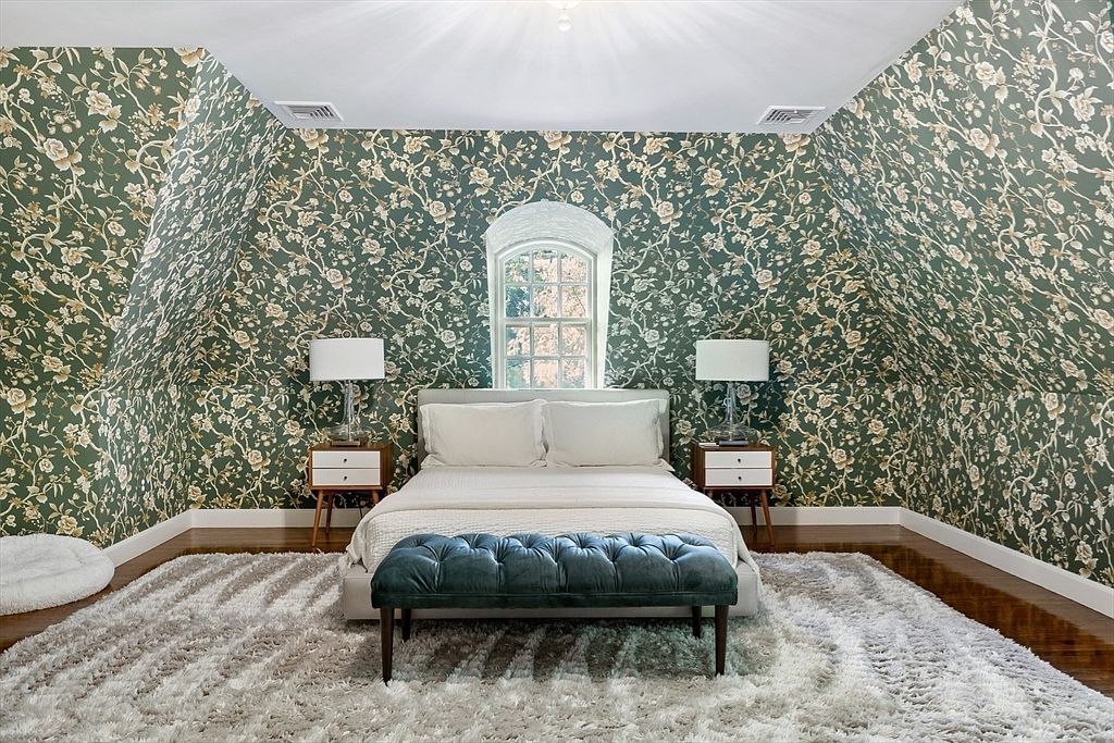 This cozy bedroom features sloped walls adorned with rich green wallpaper showcasing floral patterns, evoking a sense of tranquility. A large window allows natural light to fill the space, highlighting the white bedding and a plush, quilted bed. On either side of the bed, simple nightstands with modern lamps contribute to the room’s elegance. A soft, textured area rug invites comfort underfoot, while a tufted ottoman at the foot of the bed adds a stylish touch. The combination of earthy tones and soft materials creates a serene retreat, perfect for relaxation and restful nights.