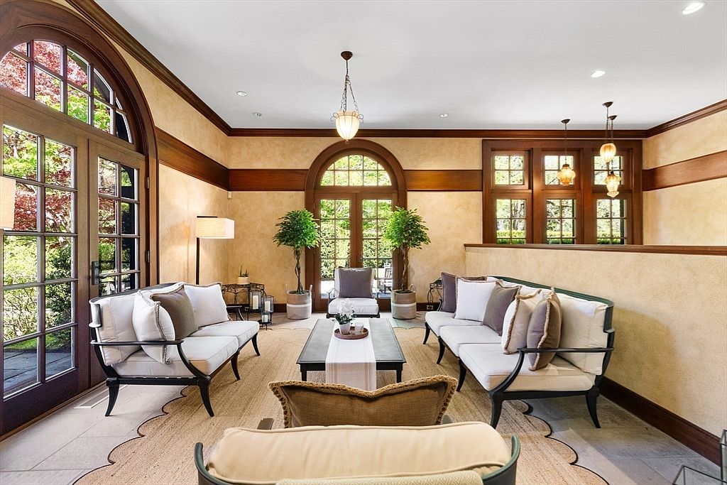 This sunroom features large, arched windows that flood the space with natural light, accentuating the warm beige walls and rich wood trimmings. Comfortable furniture includes soft, cushioned seating in subtle gray tones, adorned with cozy throw pillows, creating an inviting atmosphere. A light-colored area rug adds texture beneath a sleek coffee table, harmonizing with the overall color scheme. Lush potted plants bring a touch of greenery, enhancing the tranquil feel. Pendant lights hang elegantly, contributing to the roomโs charm. The layout promotes conversation and relaxation, making it a perfect retreat connected with nature.