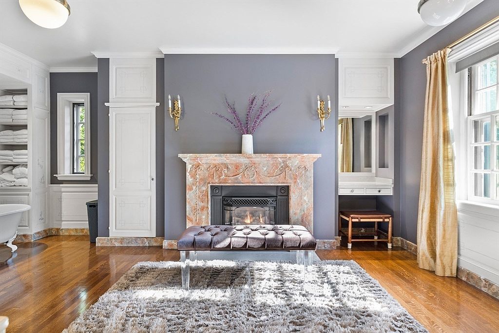 This elegant living room features a sophisticated palette of gray walls, complemented by white architectural molding and ornate detailing. A striking marble fireplace serves as the focal point, adorned with a polished mantel that includes soft pink hues. Opposite, a tufted leather bench invites relaxation, positioned atop a plush, shaggy rug that adds warmth and texture. Tall windows, framed by flowing golden curtains, usher in natural light, emphasizing the room’s spaciousness. Built-in cabinetry displays neatly arranged linens, seamlessly combining functionality with aesthetics. The overall ambiance is refined and welcoming, balancing classic and contemporary design elements.