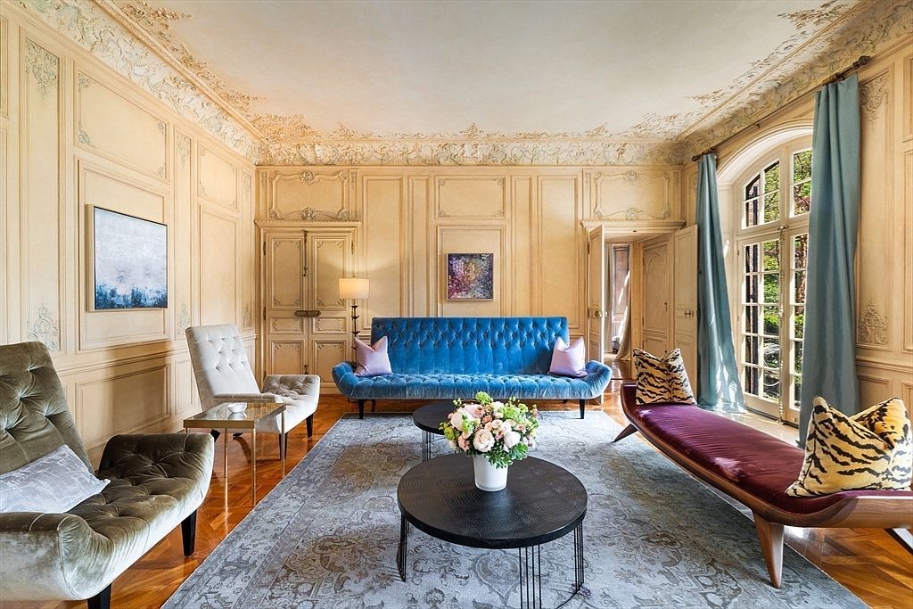 This elegant living room features intricate architectural details, showcasing paneled walls adorned with delicate carvings. A striking blue velvet sofa anchors the space, complemented by plush armchairs in muted tones. The furniture arrangement promotes a cozy yet open atmosphere, centered around a round, black coffee table that contrasts with the soft, patterned area rug beneath. Natural light filters in through large, French-style windows, framed by long curtains in a gentle blue hue. A tasteful flower arrangement adds a pop of color, while artwork hangs subtly on the walls, enhancing the sophisticated aesthetic of this historic room.