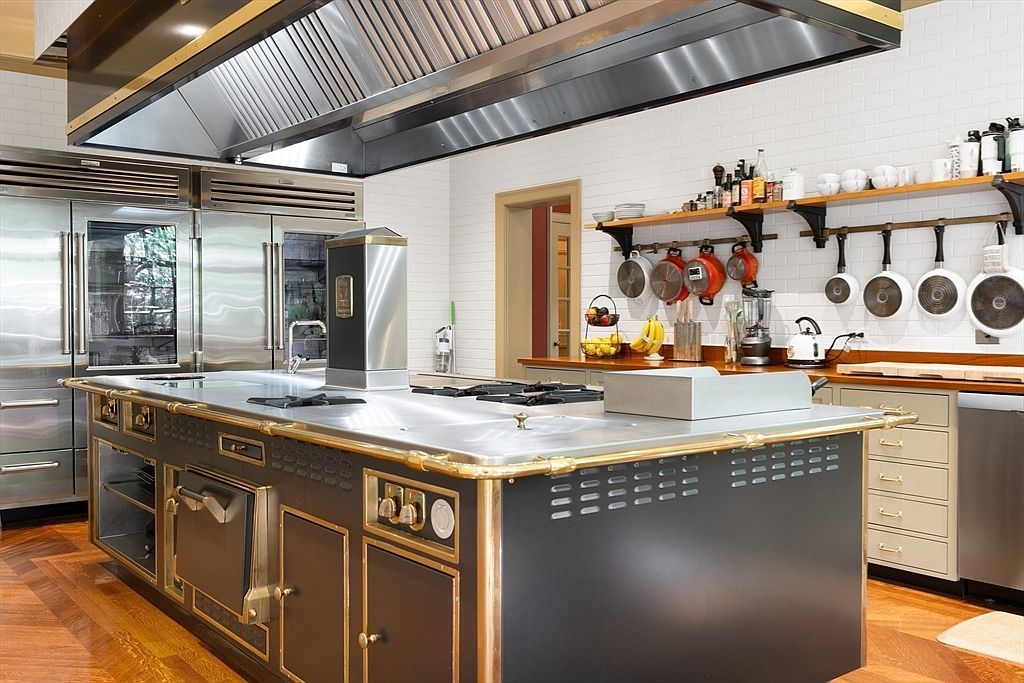 A modern kitchen showcasing a large central island with a stainless steel countertop, featuring a built-in cooktop and streamlined design elements. The color palette combines warm wood tones in cabinetry and flooring with sleek metallic finishes in appliances. A professional-grade range, accompanied by an exhaust hood overhead, dominates one wall, reflecting a dedication to culinary activities. Open shelving displays white dishware and essential kitchen items, enhancing accessibility. Decorative circular pots hang neatly from wall hooks, and a large refrigerator with mirrored finish complements the space, creating a blend of functionality and aesthetics in this culinary haven.