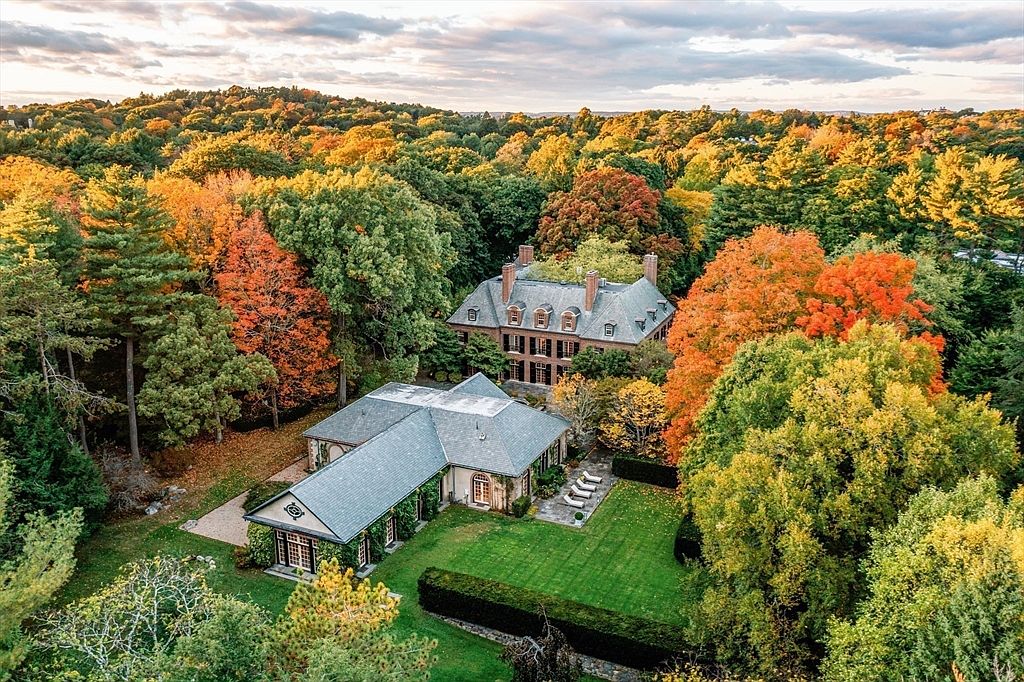 This aerial view showcases a majestic historic home surrounded by vibrant autumn foliage. The property features a spacious lawn, where the green grass contrasts beautifully with the colorful trees in shades of orange, red, and yellow. The house is designed with multiple gabled roofs and a brick facade, complemented by large windows that invite natural light. A patio with elegant seating offers an inviting outdoor space, surrounded by meticulously maintained hedges. The overall layout conveys grandeur and tranquility, set against a backdrop of lush woods, illustrating a harmonious blend of architecture and nature.