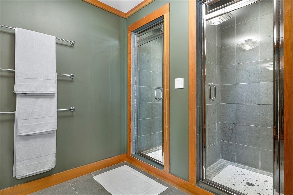 This bathroom exhibits a sleek and modern design with a calming color palette of soft green walls accented by warm wooden trim. The layout features two glass shower enclosures with polished metal hardware, showcasing glossy gray tiles that add a touch of elegance. Neatly arranged, fluffy white towels hang on a chrome rack, enhancing the room’s clean aesthetic. A stone floor with circular tiles complements the design, while a plush white mat adds comfort. Overall, the space balances functionality with a contemporary style, creating a serene retreat for personal care.