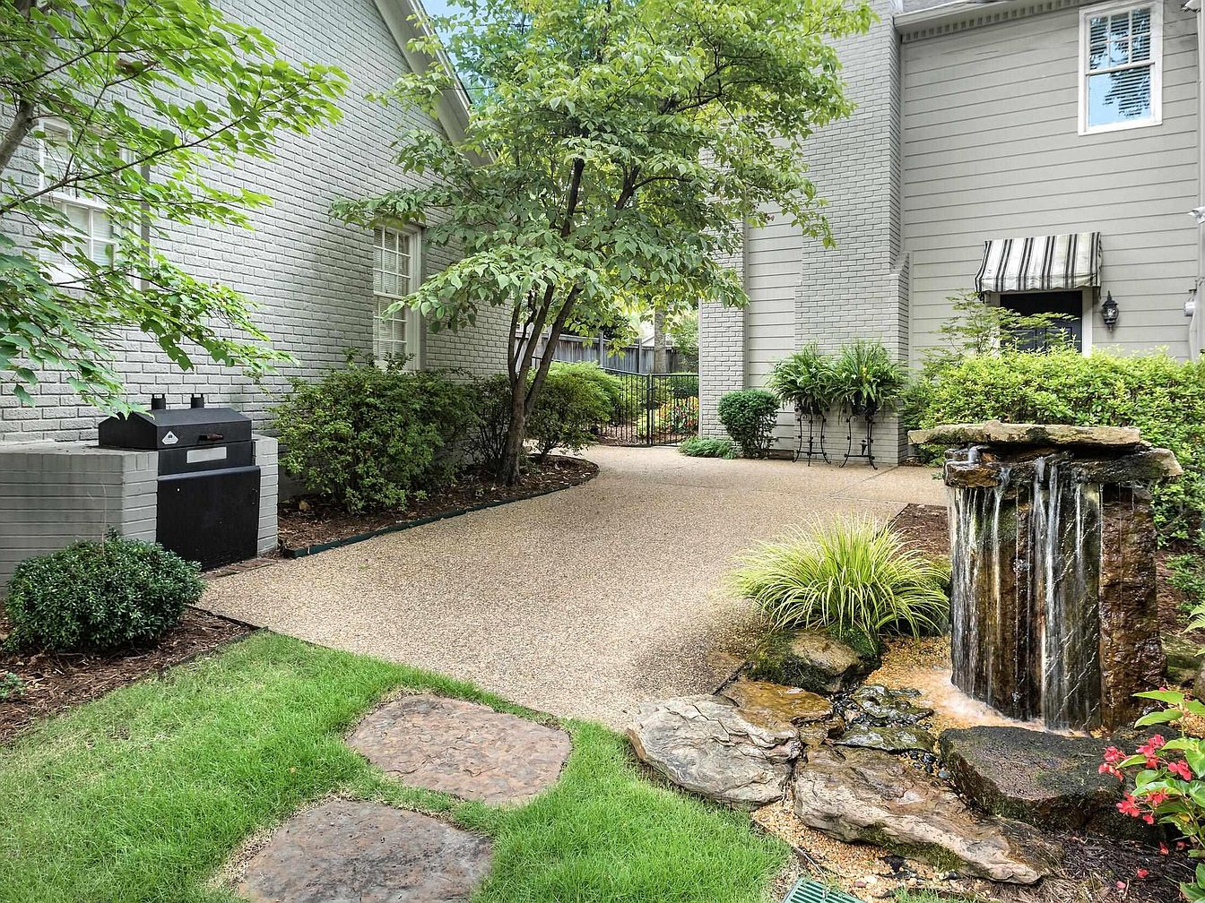 A serene outdoor courtyard featuring a blend of lush greenery, trimmed shrubs, and mature trees against light gray brick and siding exteriors. The focal point is a stone waterfall water feature nestled among ornamental grasses and large rocks, creating a tranquil ambiance. A winding pebble-textured pathway leads through the space, connecting to a wrought iron gate and patio area. Notable details include a built-in black grill set into a matching brick base, and elegant planters with ferns beneath a black-and-white striped awning. The layout feels private, inviting, and thoughtfully landscaped, ideal for relaxation and outdoor gatherings.