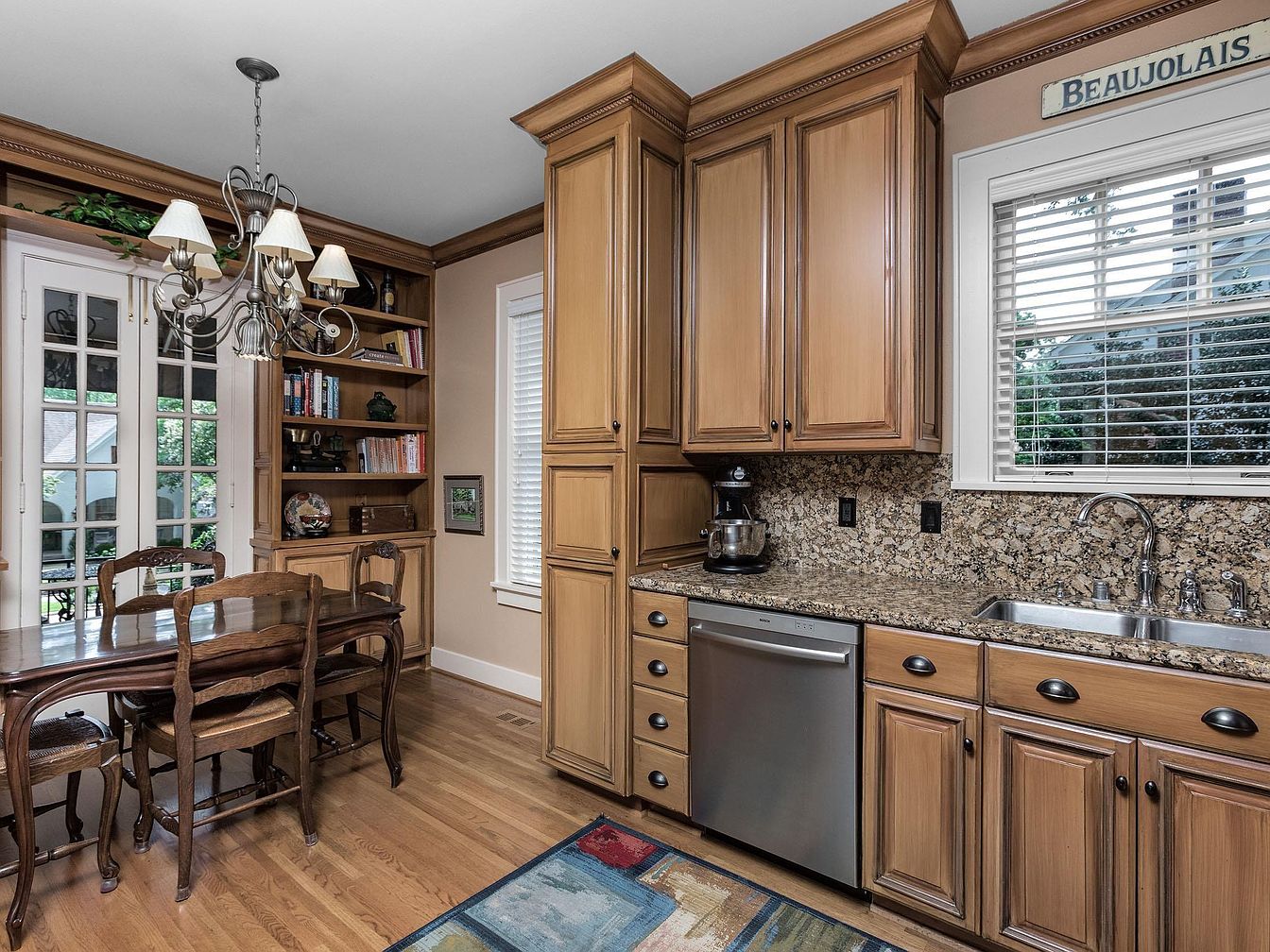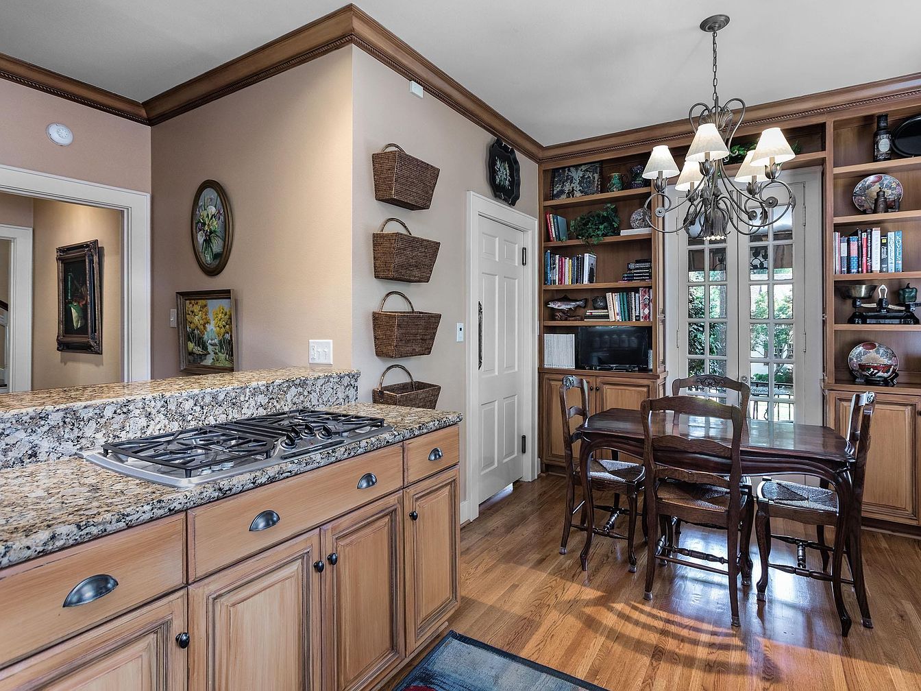 This space blends a kitchen and dining nook in a warm, traditional style. A granite-topped counter and stove extend toward the left, with cabinetry finished in light natural wood. The dining area features a dark wooden table with four matching chairs beneath a decorative iron chandelier. Built-in bookcases and cabinets line the back wall, filled with books, decorative plates, a globe, and greenery. French doors offer a view to the outdoors, adding brightness to the room. The walls are a soft neutral color, trimmed with wood crown molding. Wicker baskets, wall art, and hardwood floors complete the welcoming, classic look.