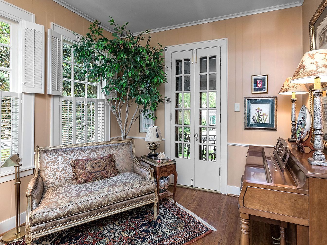 A cozy corner of a traditional sitting room, featuring pale peach-paneled walls and warm hardwood floors. Two tall windows with divided panes and white plantation shutters flood the area with natural light. An elegant settee with ornate wood trim and lavish, patterned upholstery sits angled on an intricate, multicolored oriental rug. Beside it, a vintage side table holds a classic brass lamp. A potted tree adds greenery by the window. French doors with glass panes open to the outdoors, while a slender upright piano rests along the right wall beneath framed botanical prints and a decorative table lamp, lending the space a refined, inviting atmosphere.