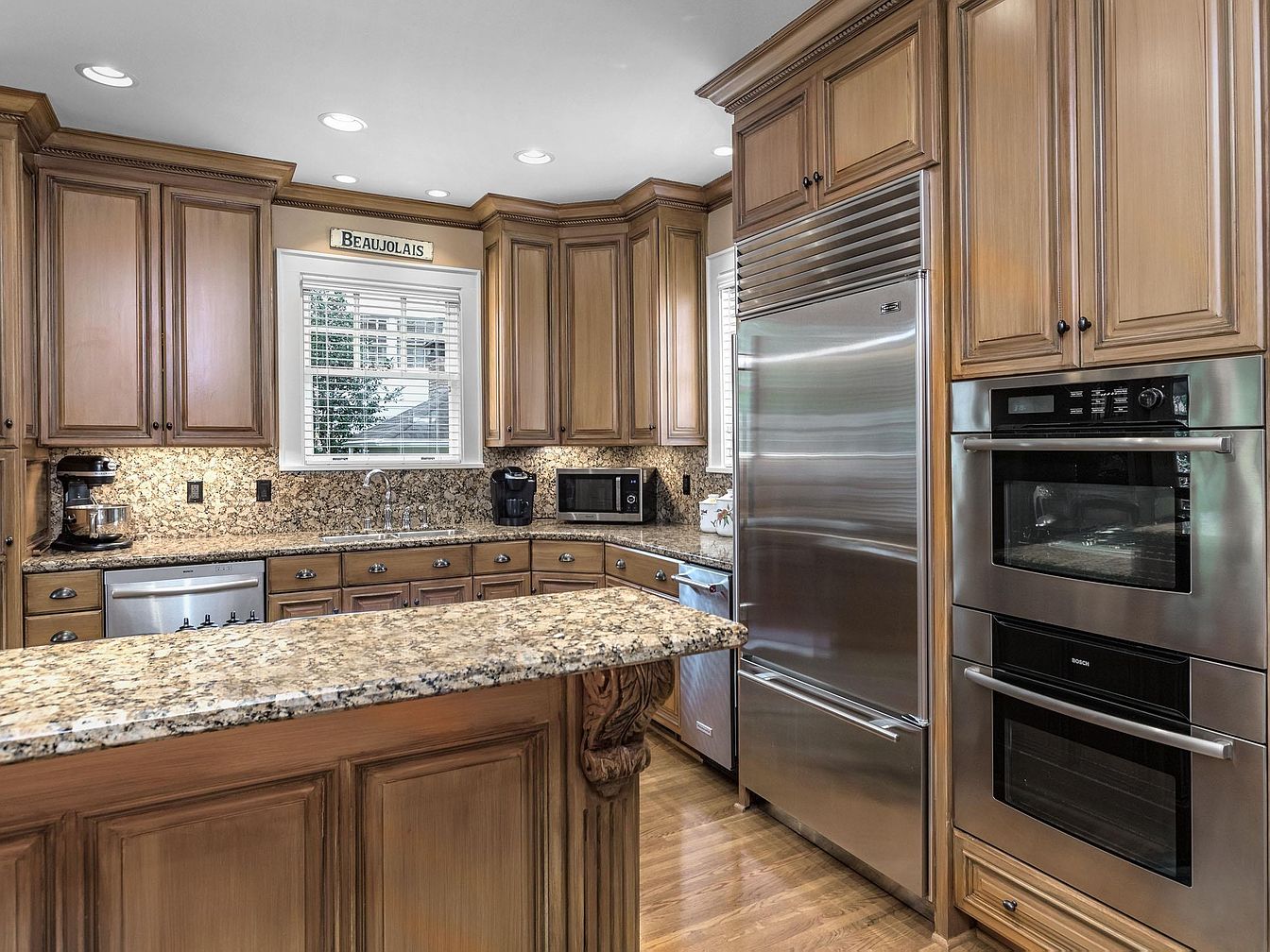A spacious kitchen featuring warm, honey-toned wooden cabinets that extend up to the ceiling, providing ample storage space. Polished granite countertops and matching backsplash contribute a luxurious and classic atmosphere. Stainless steel appliances, including double ovens, a large refrigerator, dishwasher, and a built-in microwave, bring a modern touch to the traditional design. The central peninsula counter offers extra workspace. Overhead recessed lighting illuminates the area, while a window above the sink lets in natural light. Small appliances, like a coffee maker and stand mixer, are neatly arranged. The overall aesthetic is inviting, clean, and blends traditional elegance with modern functionality.