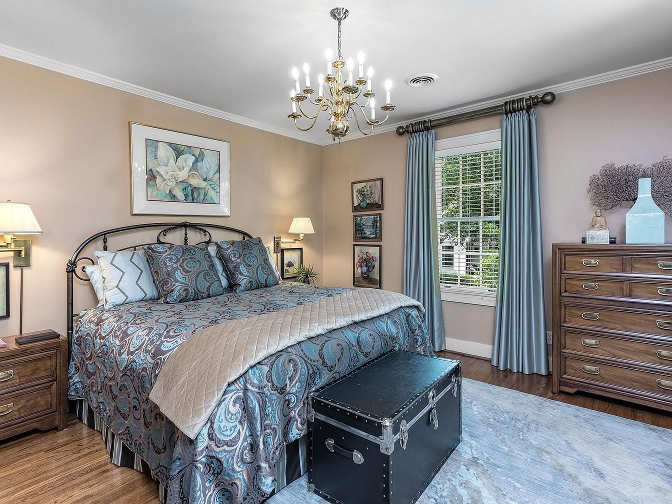 A spacious and elegant bedroom features a large bed with a decorative metal headboard, adorned with patterned bedding in blue and beige tones. Two wooden nightstands, each with table lamps mounted on the wall above, flank the bed. The soft beige walls are accented with floral artwork and framed prints. A classic brass chandelier hangs from the ceiling, providing a touch of vintage charm. Next to the window, which is dressed in light blue curtains, stands a tall wooden dresser topped with decorative items, including a large blue vase. A black trunk at the foot of the bed and a light blue area rug complete the space.