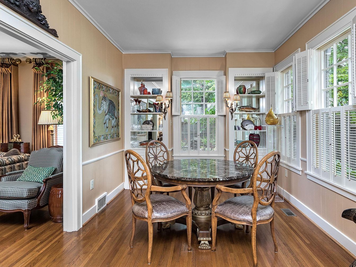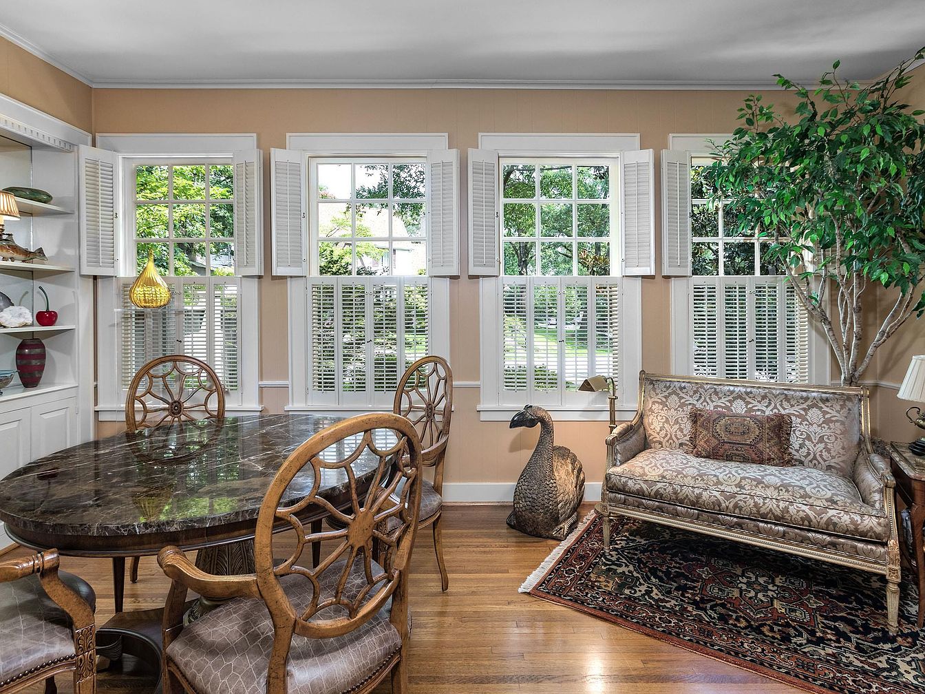A small, sunlit dining area features a round marble-topped table surrounded by four elegant wooden chairs with carved backs and upholstered seats. The walls are painted a soft beige, complemented by white trim and wood wainscoting. Two built-in shelving units, filled with eclectic decor and glassware, flank the large central windows that let in plenty of natural light. Half-height plantation shutters provide privacy while maintaining brightness. Adjacent to the dining nook, an inviting sitting room with richly patterned upholstery, leafy green plants, and gold-toned drapery is visible, creating a cozy, sophisticated atmosphere.