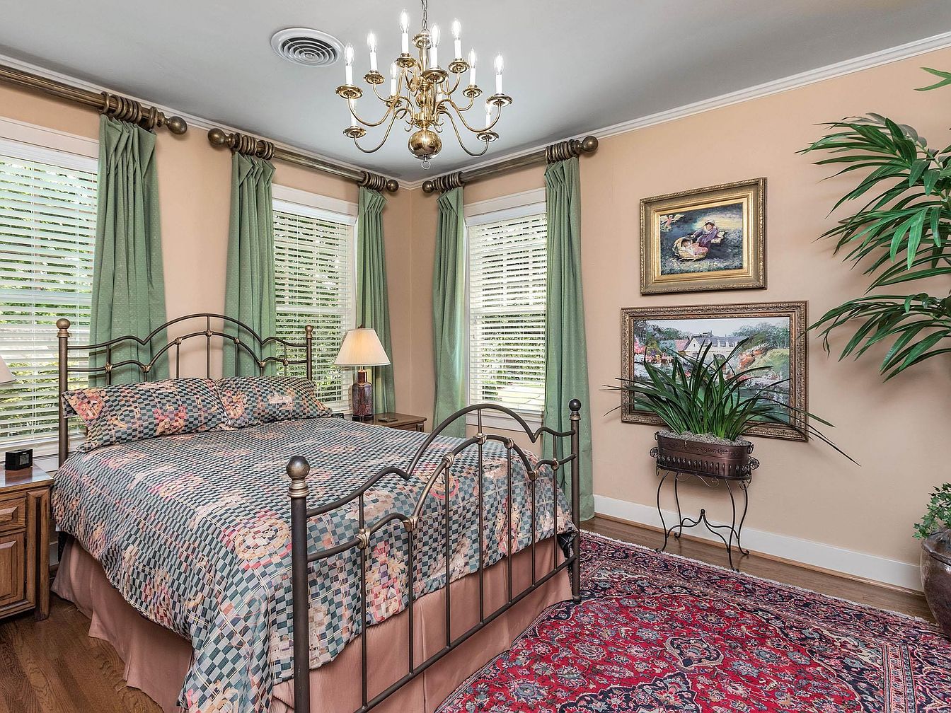 A cozy bedroom corner features a vintage wrought-iron bed centered between two large windows dressed with sage green curtains and white blinds, bathing the room in natural light. The walls are painted a warm beige, complemented by light wood side tables topped with table lamps. The bedding sports a traditional patchwork pattern with subtle florals in muted tones. A bold, richly patterned red Persian rug covers the hardwood floor, adding warmth and texture. Wall art, including framed paintings and decorative plants, enhance the classic and inviting atmosphere of this personal retreat. An ornate brass chandelier completes the elegant, historic decor.