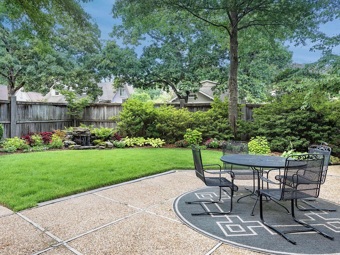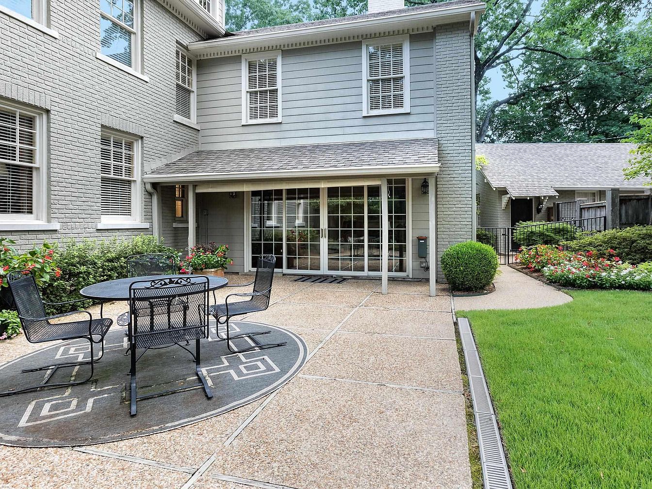 A tranquil outdoor space featuring a round black metal table with four matching chairs arranged on a large circular geometric rug. The surrounding patio flooring is textured stone, offering a clean and inviting walkway leading to glass sliding doors set into a gray brick exterior wall. The home’s facade is painted in soft gray tones with white framed windows and classic colonial trim. Well-manicured green grass and vibrant flower beds with low shrubs and blooming plants enhance the edges, creating a peaceful, private courtyard ambiance under the shade of mature trees. This setting blends comfort and elegance for outdoor relaxation.