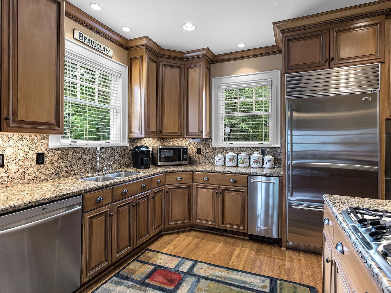 Warm wood cabinetry extends along two walls, meeting at a corner with granite countertops and matching granite backsplash. Upper and lower cabinets offer ample storage, with brushed metal hardware adding a classic touch. Under two bright windows, stainless steel appliances include a large refrigerator, dishwasher, and double sink. A coffee maker and microwave sit on the counter, while a row of decorative ceramic canisters adds vintage charm. Overhead recessed lighting highlights the golden-brown tones of wood and stone. A colorful area rug with geometric patterns softens the hardwood floor, tying the culinary workspace together with a welcoming, traditional ambiance.