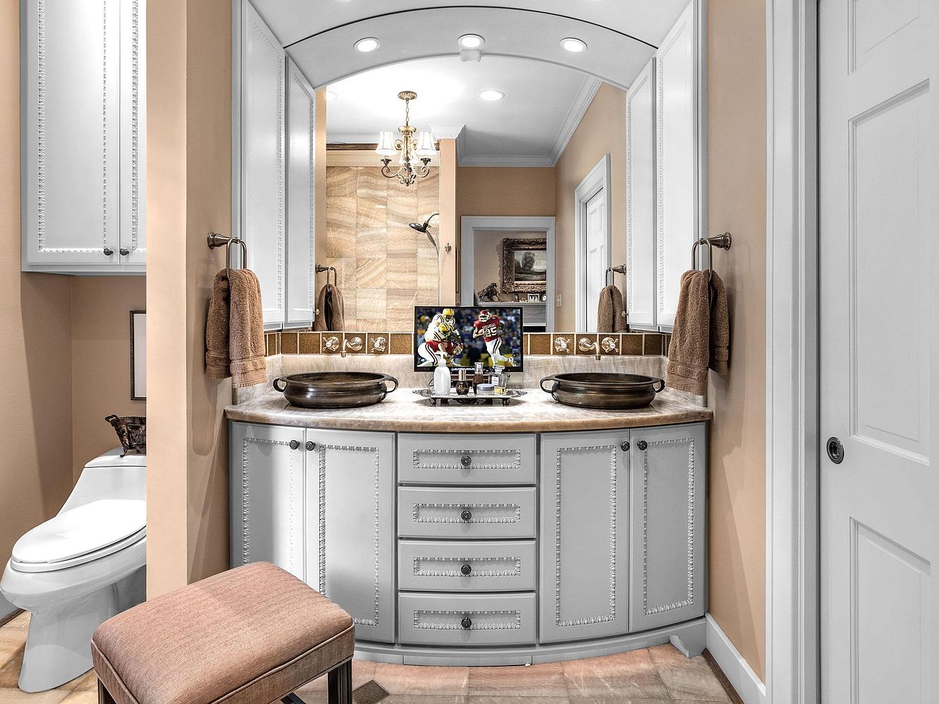 A softly lit bathroom features a curved vanity with dual metallic vessel sinks and ornate silver cabinetry. The backsplash includes decorative brown and gold tile accents, complemented by neutral beige walls. Twin mirrors are framed by white custom cabinetry and flanked by brown terry towels hanging on metal rings. Overhead, a gracefully arched ceiling is set with recessed lighting, while a glimpse into a separate shower area reveals a chandelier and patterned stone tile. The vanity top is marble, paired with a plush beige upholstered bench for seating, creating an elegant, welcoming atmosphere grounded in classical detail.