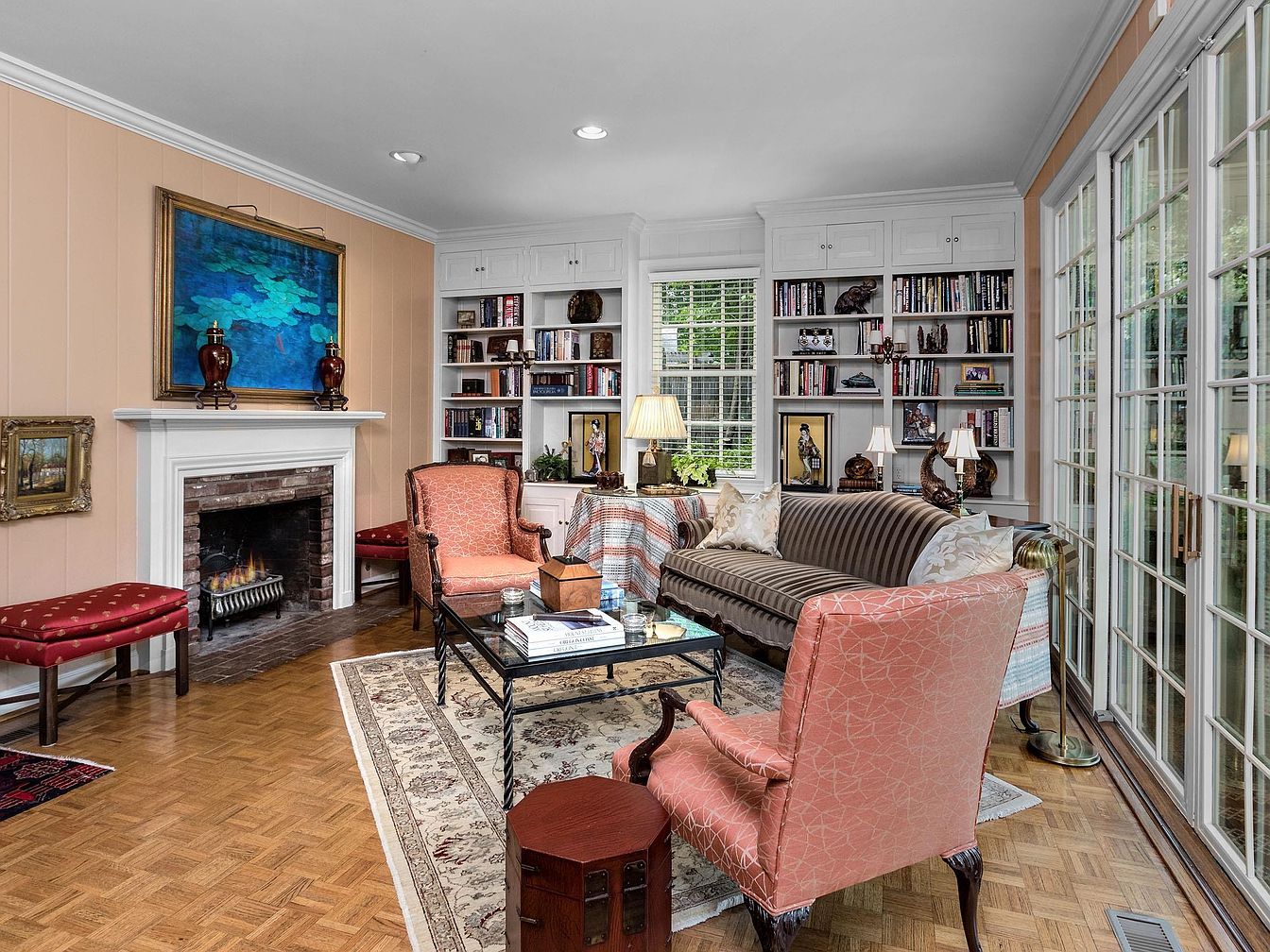 This space features a classic living room with warm peachy wall panels and crisp white crown molding. A brick fireplace with a white mantel takes center stage, topped with a large blue and green abstract painting and two ornate lamps. Flanking the fireplace are built-in bookshelves filled with books, framed photos, and decorative objects, providing both function and charm. Comfortable seating includes a striped, dark-colored sofa adorned with white accent pillows and two upholstered coral armchairs with wooden frames. A glass coffee table on a patterned area rug anchors the furniture, and natural light pours in from tall, multi-paned French doors along one side of the room.