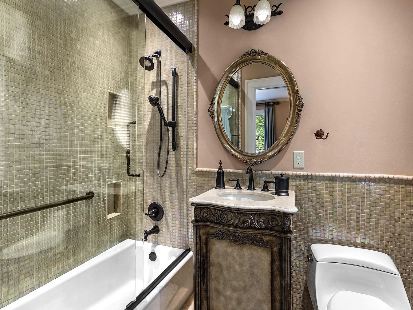 Compact bathroom showcasing a classic design with an ornate wooden vanity featuring intricate carvings and a marble countertop. Above the sink, a large round gilded mirror is mounted on a soft beige wall, complemented by a traditional dual-bulb vanity sconce. The bathtub and shower area is enclosed by a clear glass panel and adorned with light, iridescent mosaic tiles that wrap around the room, creating a subtle shimmer. Fixtures such as the faucet, towel hook, and shower hardware are finished in dark bronze, contrasting elegantly against the lighter tones. A large white toilet sits adjacent to the vanity, completing the layout.