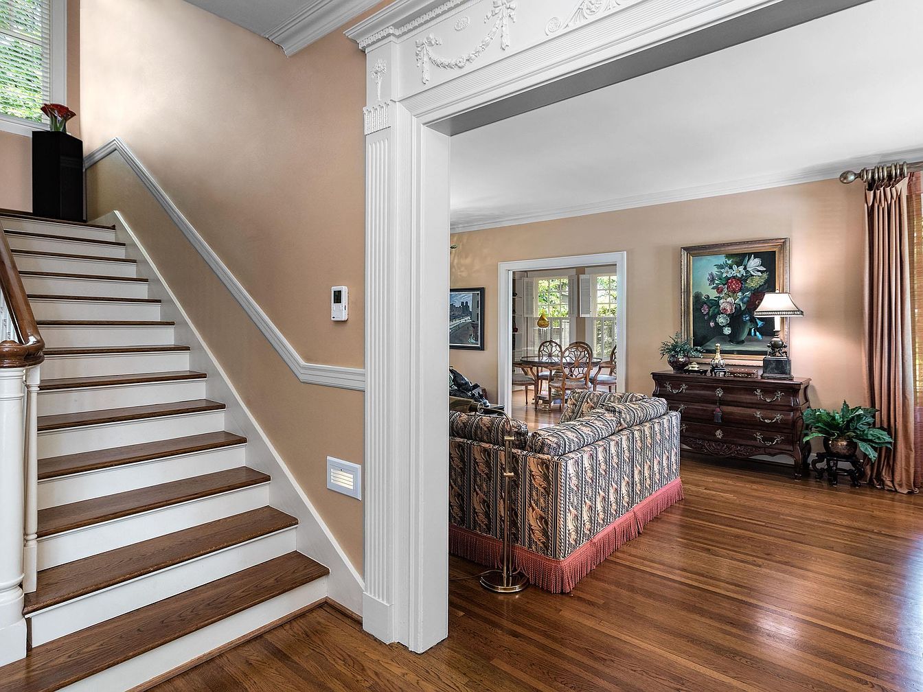 A stately wooden staircase with crisp white risers and polished brown treads sits to the left, complemented by traditional wooden banisters and a beige wall. To the right, a wide opening with ornate white molding leads into a parlor, where a patterned couch anchors the space. The walls are a warm peach color, and golden-brown drapes frame tall windows. A dark, carved wood chest with an intricate design displays a lamp and floral painting, while a potted plant adds greenery. In the background, a dining space with a table and chairs is visible, enhancing the inviting, historic character.