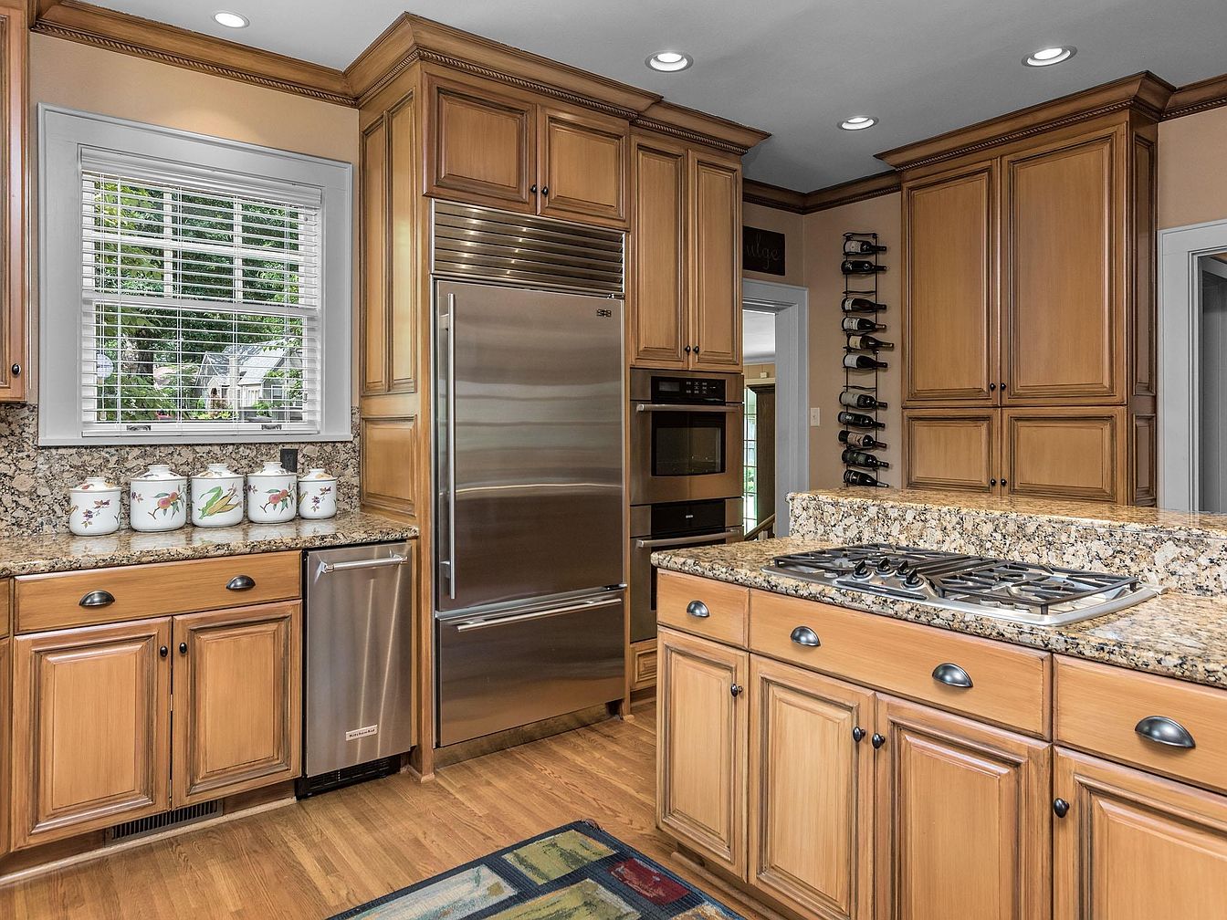 A warm and inviting kitchen featuring honey-toned wood cabinetry with traditional paneling, topped with speckled granite countertops. The layout includes a peninsula with a built-in stainless steel gas cooktop and a seamless integration of modern stainless steel appliances, such as a large refrigerator and dishwasher. Decorative canisters with floral motifs sit neatly beneath a window adorned with white blinds, letting in ample natural light. A vertical wine rack adds a touch of sophistication beside ample cabinet storage. The light hardwood flooring is anchored by a patterned area rug, contributing to the cozy, classic aesthetic.