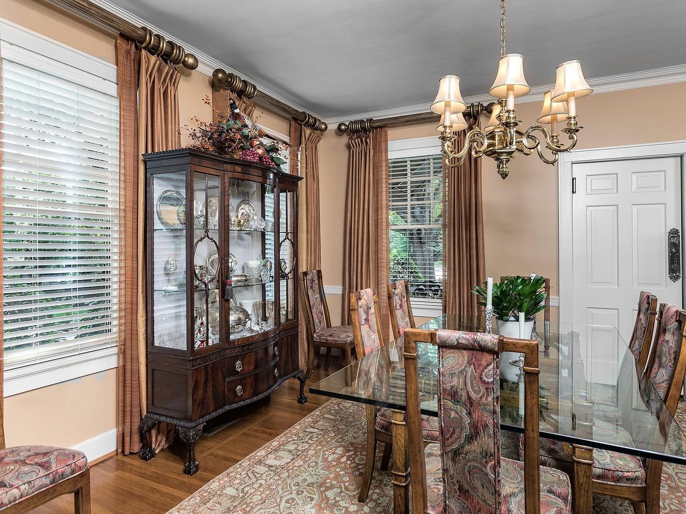 A formal dining room with soft beige walls and warm wooden floors creates an inviting, classic ambiance. The glass-topped dining table has a sturdy wooden base and is surrounded by six padded chairs upholstered in paisley-patterned fabric in mauve and earth tones. On one wall, a large, dark wood china cabinet holds an array of silverware and glass collectibles, topped with a decorative floral arrangement. Two tall windows, adorned with bronze-accented curtain rods and sienna drapes, fill the room with natural light. A grand brass chandelier with white candle-shaped lamps hangs above the table, adding elegance to the traditional setting.