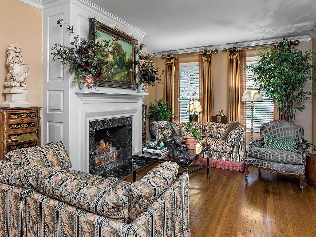 A traditional living room with polished hardwood floors and warm beige walls. Two patterned sofas and an upholstered armchair provide seating around a glass coffee table set with decorative pieces. A white-painted fireplace with black marble surround sits centrally, topped by a landscape painting and floral arrangements. Tall drapes in a golden brown color frame two large windows, allowing plenty of natural light. Ornamental touches include a sculpted lion atop an antique chest, leafy indoor plants, and classic brass floor lamps, which all contribute to an elegant, classic American parlor ambience with a harmonious earth-toned color scheme.