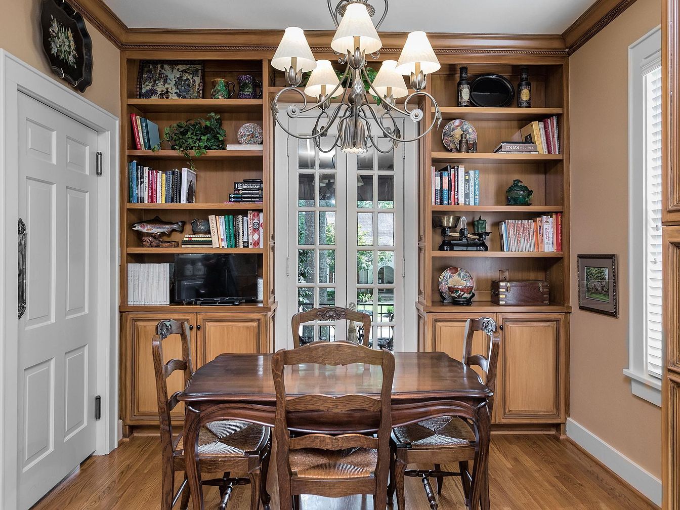 A cozy dining space features a medium-toned wooden table with intricately carved chairs, forming the room’s centerpiece. Built-in floor-to-ceiling bookshelves, finished in warm honey wood, frame a pair of French doors with glass panes that open to the outdoors. Books and decorative items like a globe, ceramics, and framed art add color and interest to the shelves. Above, a classic chandelier with multiple lampshades provides soft lighting. The walls are painted a muted tan, complemented by crisp white trim around the door and window. Hardwood floors add warmth and elegance, enhancing the traditional yet inviting atmosphere.