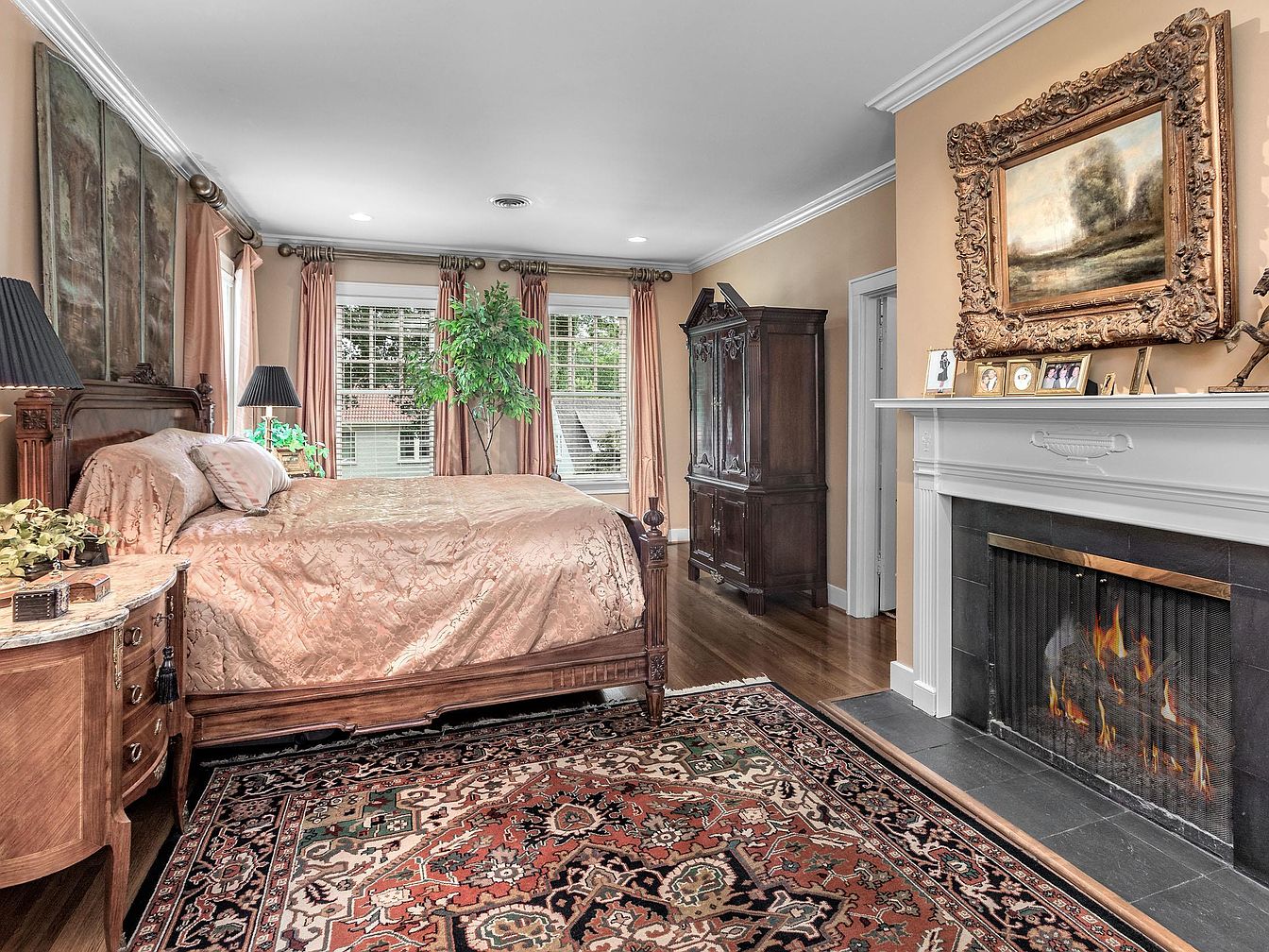 This spacious bedroom features a warm, traditional aesthetic with a large fireplace and ornately framed artwork above it as a focal point. The bed has an intricate wooden headboard and is dressed in a pale, shimmer-patterned coverlet, matching the peach-toned walls and rich drapery. Decorative black lamps frame the bed, while a dark wood armoire stands in the corner. An ornate rug with red, black, and ivory patterns covers the hardwood floor. The room is brightened by windows with golden drapes, filtered natural light, and a tall indoor plant adds greenery for an inviting, elegant atmosphere.