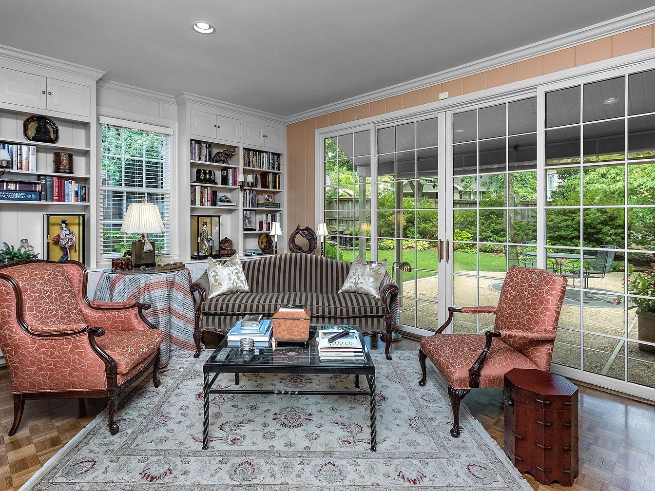 This room features a cozy sitting area with two armchairs upholstered in a coral patterned fabric and a vintage-styled striped loveseat, all arranged around a glass coffee table atop a pale decorative rug. Built-in white bookshelves line one wall, filled with books, art pieces, and small sculptures. Tall windows with white blinds allow natural light to fill the space. Along another wall, large sliding glass doors open out to a green backyard, visually connecting the interior and exterior. The overall aesthetic blends traditional furnishings with abundant daylight to create a warm, inviting atmosphere.