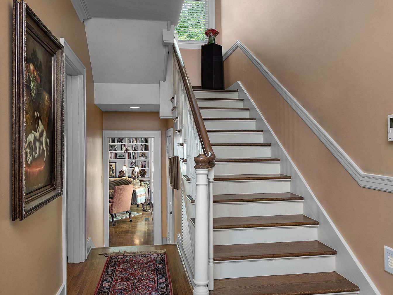 A classic, warmly lit stairway features wooden steps with white risers and a polished bannister highlighted by subtle gray trim. Walls are painted a soft beige, complemented by a Persian-style runner along the hardwood floor. A framed painting with a traditional still-life motif hangs on the left wall. At the top of the stairs, a modern black vase holds red flowers beneath a window offering natural light. Beyond the landing, a view into a cozy room reveals bookshelves, armchairs, and table lamps, blending a welcoming, historic charm with refined elegance and comfort throughout the transitional space.