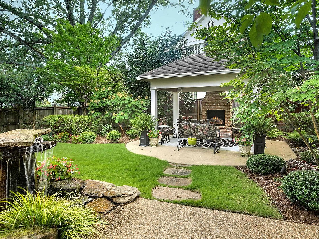 A lush backyard garden features a covered patio area with a brick outdoor fireplace, creating a cozy and inviting seating space. The patio is framed by mature trees and well-maintained hedges, with a pathway of natural stone leading across a neatly manicured lawn. Ornamental plants in decorative pots and vibrant flowers brighten the setting, while a small stone waterfall adds a tranquil touch in the foreground, the water cascading gently over rocks. The scene blends natural elements with classic outdoor furniture, emphasizing comfort and harmony with nature in a private, serene environment.
