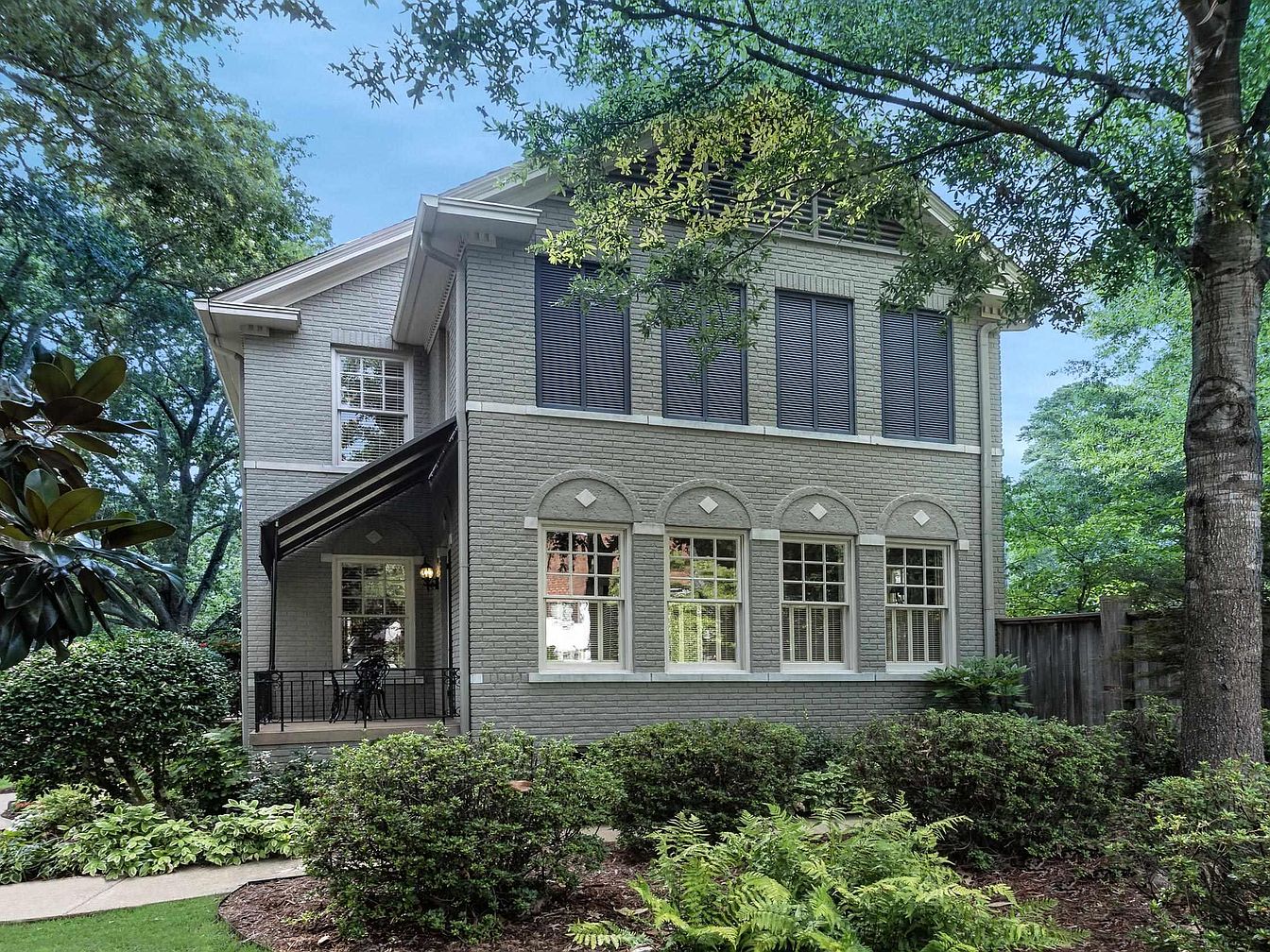 A stately two-story house built from light gray painted brick is surrounded by lush greenery and mature trees, presenting a serene and inviting curb appeal. The front yard is landscaped with low shrubs, ferns, and manicured plants, creating a welcoming path to the home. Architectural details such as arched window frames and white trim add elegance and character, while the symmetrical placement of window shutters on the upper floor enhances the historic charm. A small covered porch with wrought iron railings and a hanging lantern sits beside the main entrance, contributing to the classic early 20th-century American home aesthetic.