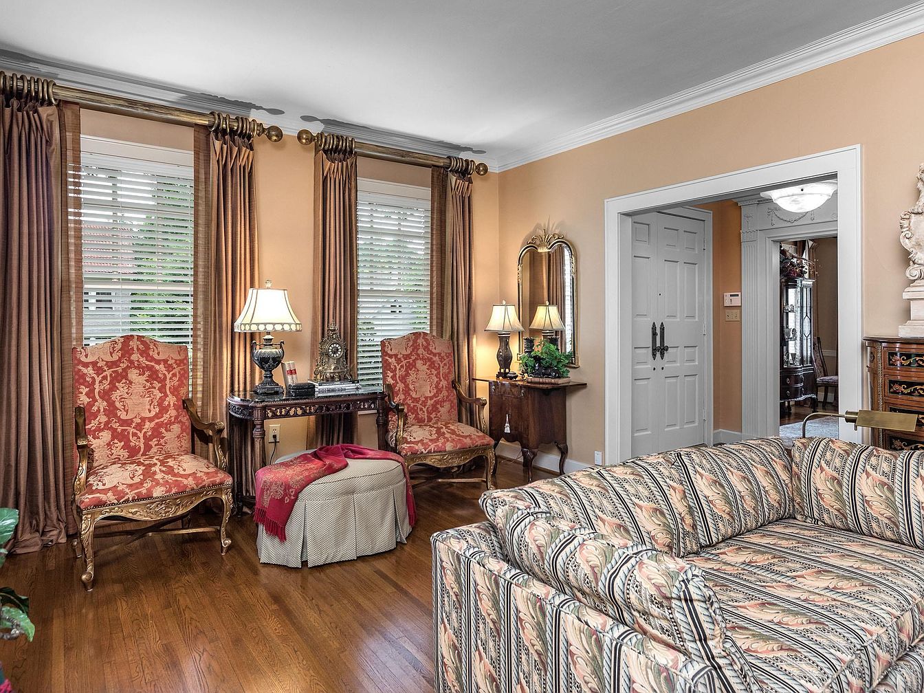 Traditional living room with warm beige walls, white crown molding, and hardwood flooring. Two ornate red and gold-patterned armchairs are positioned in front of large windows, framed by rich brown drapes and blinds, flanking a classic wood side table with a black lamp and decorative items. An upholstered ottoman with a red throw lies between the chairs. To the right, a console table with a gilded mirror and lamps adds elegance, and a glimpse of the entryway with white double doors is visible. The foreground features a patterned sofa with muted earth tones, enhancing the vintage ambiance.