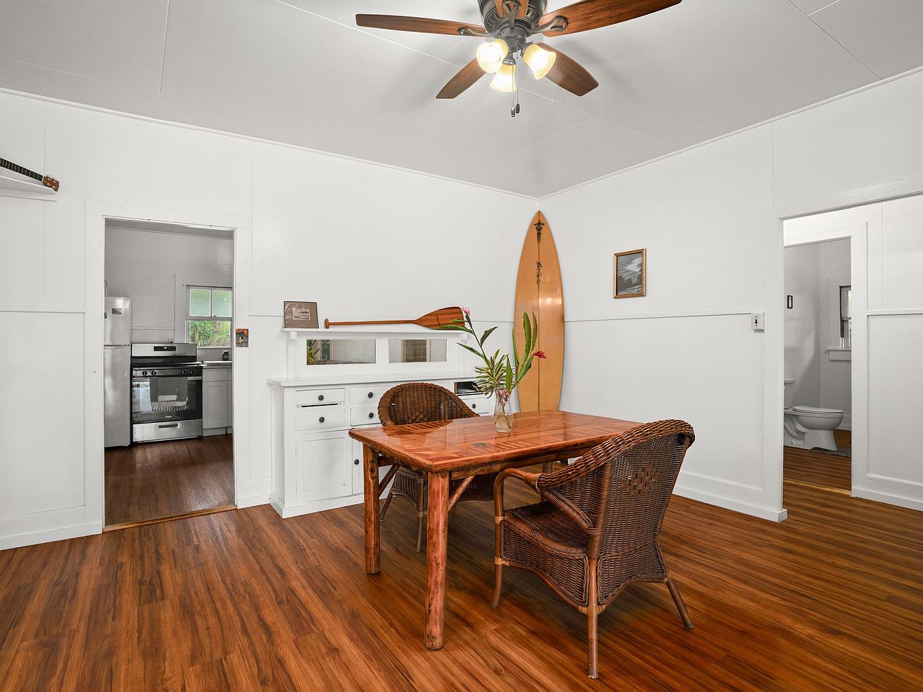 A cozy dining space features warm-toned wood flooring and crisp white paneled walls that evoke a clean, airy feel. A rustic wooden table, surrounded by woven wicker chairs, serves as the centerpiece. Nautical decor elements, such as a vintage wooden paddle resting on a built-in sideboard and a classic surfboard propped against the wall, add coastal charm. A ceiling fan with wooden blades hangs overhead, offering light and a tropical touch. The adjacent kitchen can be seen through an open doorway, with stainless appliances and white cabinetry. To the right, a glimpse of a bathroom is visible, reinforcing the open, welcoming layout.
