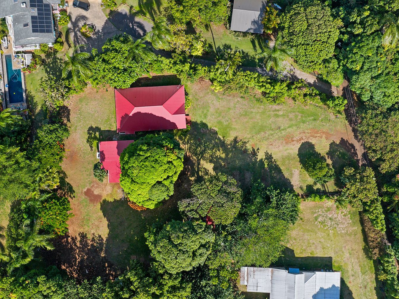 A charming historic American home sits at the center of a lush green lot, standing out with a steep red metal roof and a deep shaded porch. The front lawn is expansive, bordered by dense trees and vibrant tropical foliage, with a few tall palms and other mature trees providing shade and privacy. The house features a light exterior, simple white railings, and a brick-red set of stairs leading up to the inviting entry. The overall look merges rural simplicity with tropical abundance, exuding a tranquil, secluded feel perfect for relaxation and blending seamlessly with the natural surroundings.