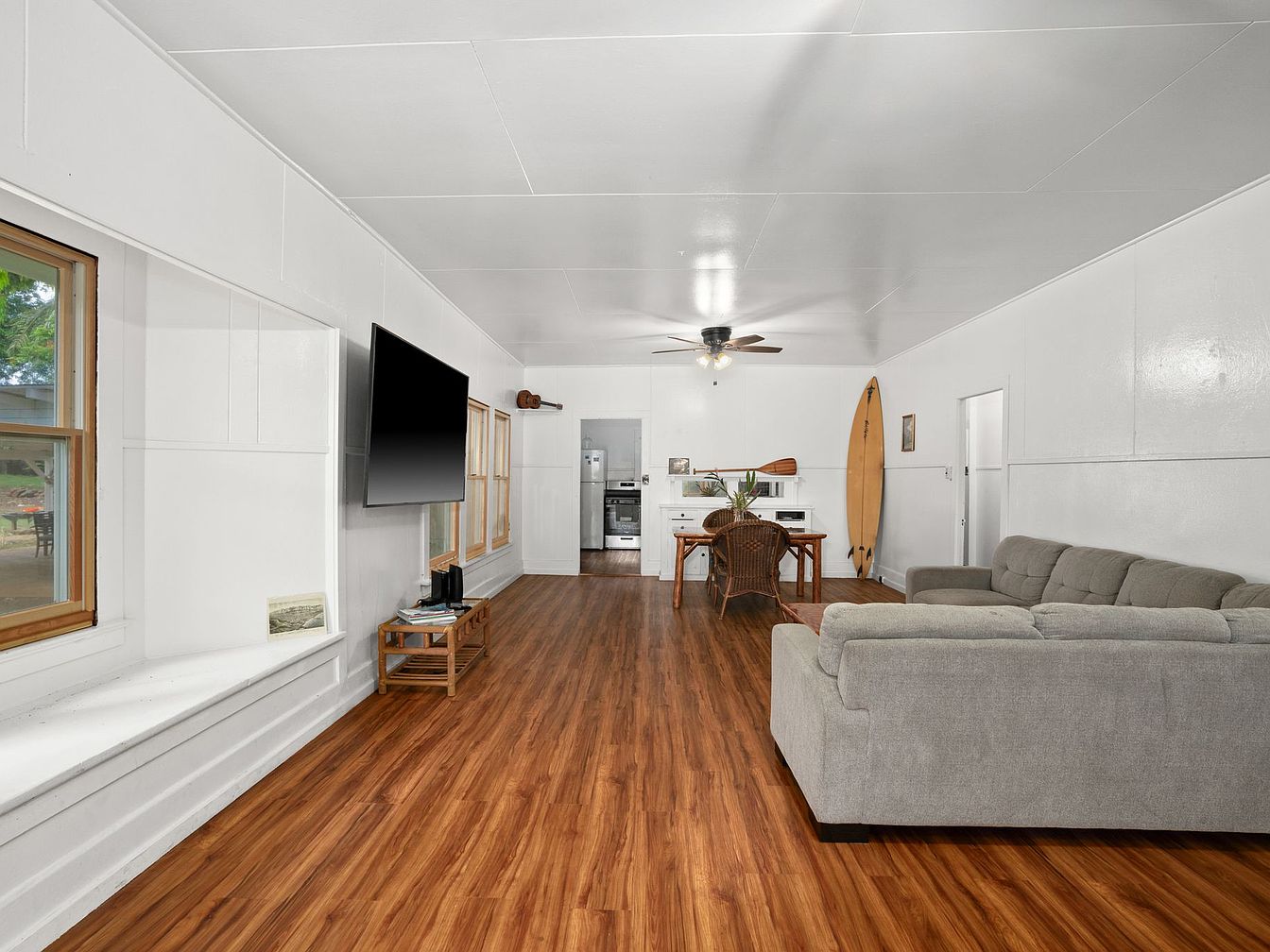 Open concept space with crisp white paneled walls and ceiling, featuring warm, wood-toned flooring that adds a cozy, inviting feel. A plush gray sectional dominates one side, paired with a wooden coffee table, and faces a wall-mounted flat screen TV above a small media console. Large windows let in natural light and provide outdoor views. A built-in bench sits under one window, adding functionality and charm. At the far end, a dining area includes a rattan chair, wooden dining table, and coastal decor like a vintage surfboard and oar displayed on the wall, evoking relaxed, beachy vibes.