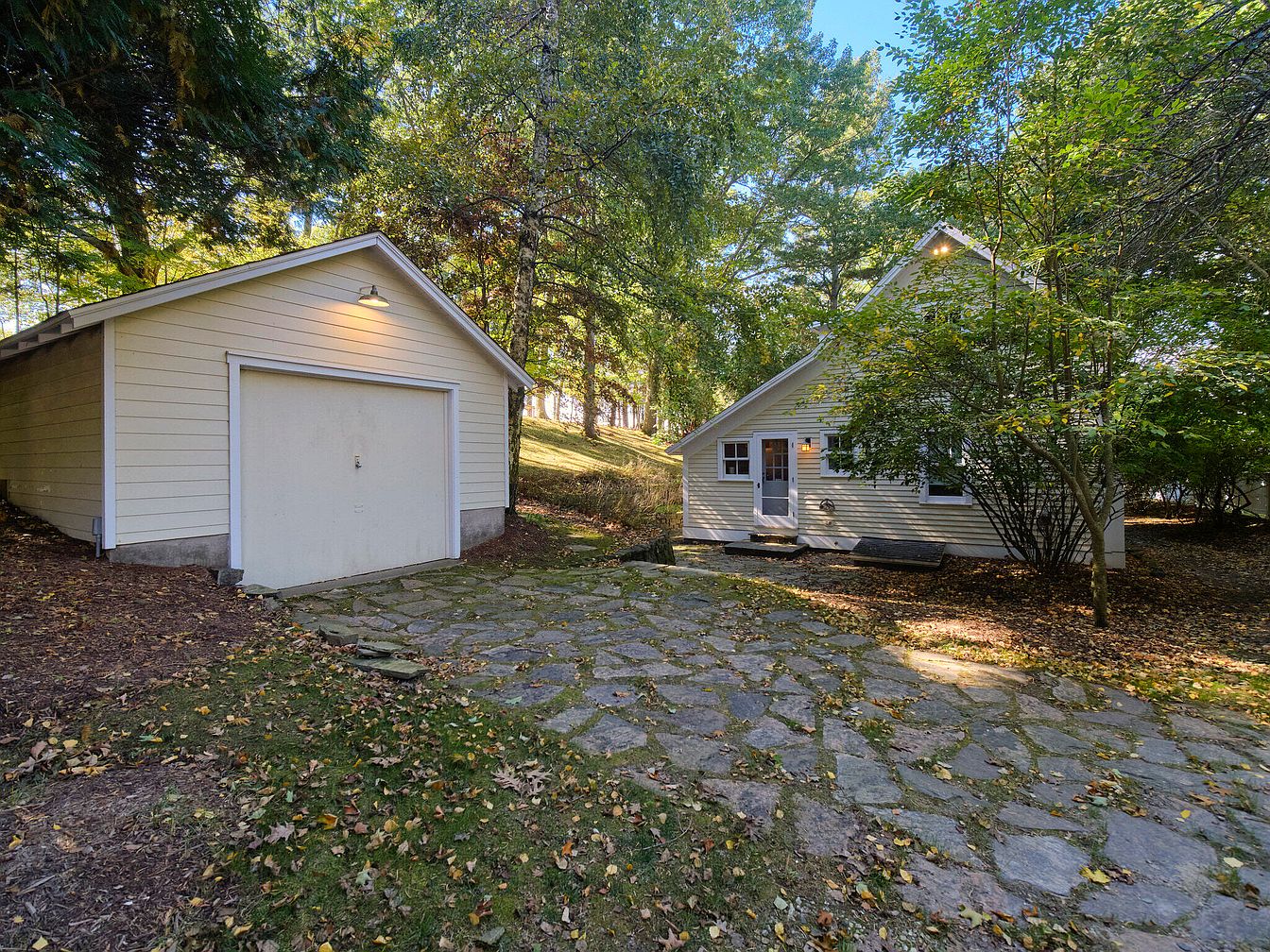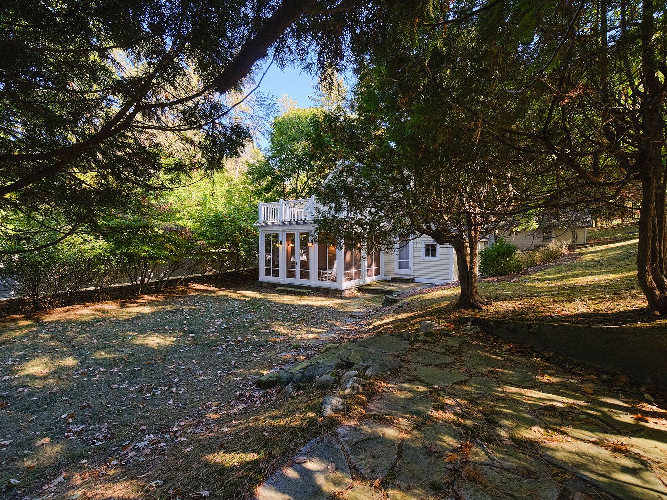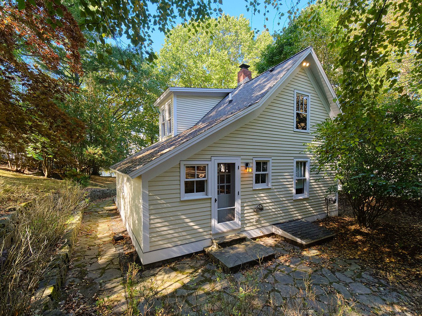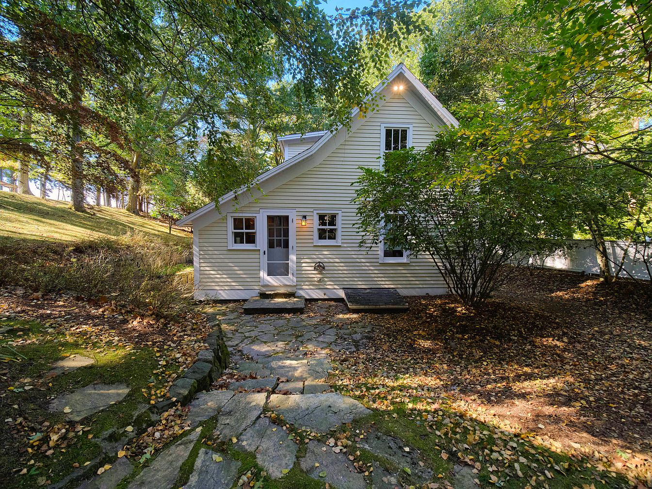 The image shows the side exterior of a charming historic American home. The structure features a light yellow clapboard siding and a steeply pitched roof, hinting at traditional architectural style. Windows are symmetrically placed, framed in white, allowing natural light to flood the interior. The entryway is inviting, with a simple wooden door and a small, covered porch. Surrounding the house, a rustic stone pathway leads through a landscaped area filled with lush greenery. Mature trees and shrubs provide a natural barrier, enhancing the property’s privacy while adding to its serene, pastoral appeal.