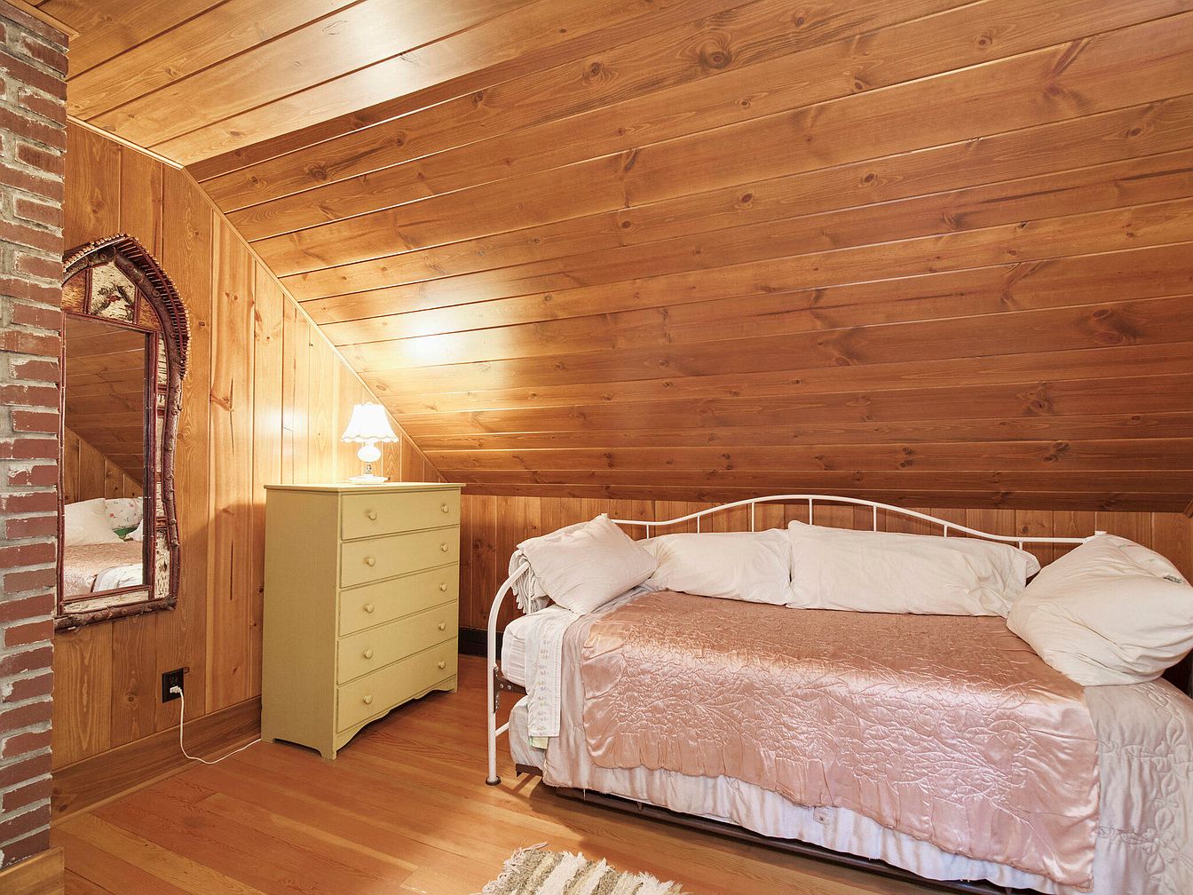 This cozy attic bedroom features slanted wood-paneled walls and ceiling, enhancing the rustic charm. A white metal daybed with numerous plush pillows and an elegant pink bedspread offers a welcoming resting space. A light yellow chest of drawers stands nearby, adding a touch of color against the warm wood tones. The vintage mirror framed in wicker reflects natural light, complemented by a small lamp casting a soft glow. Warm wooden floors create a seamless transition, while the exposed brick wall adds character and texture. Overall, the space feels intimate and inviting, ideal for a peaceful retreat.