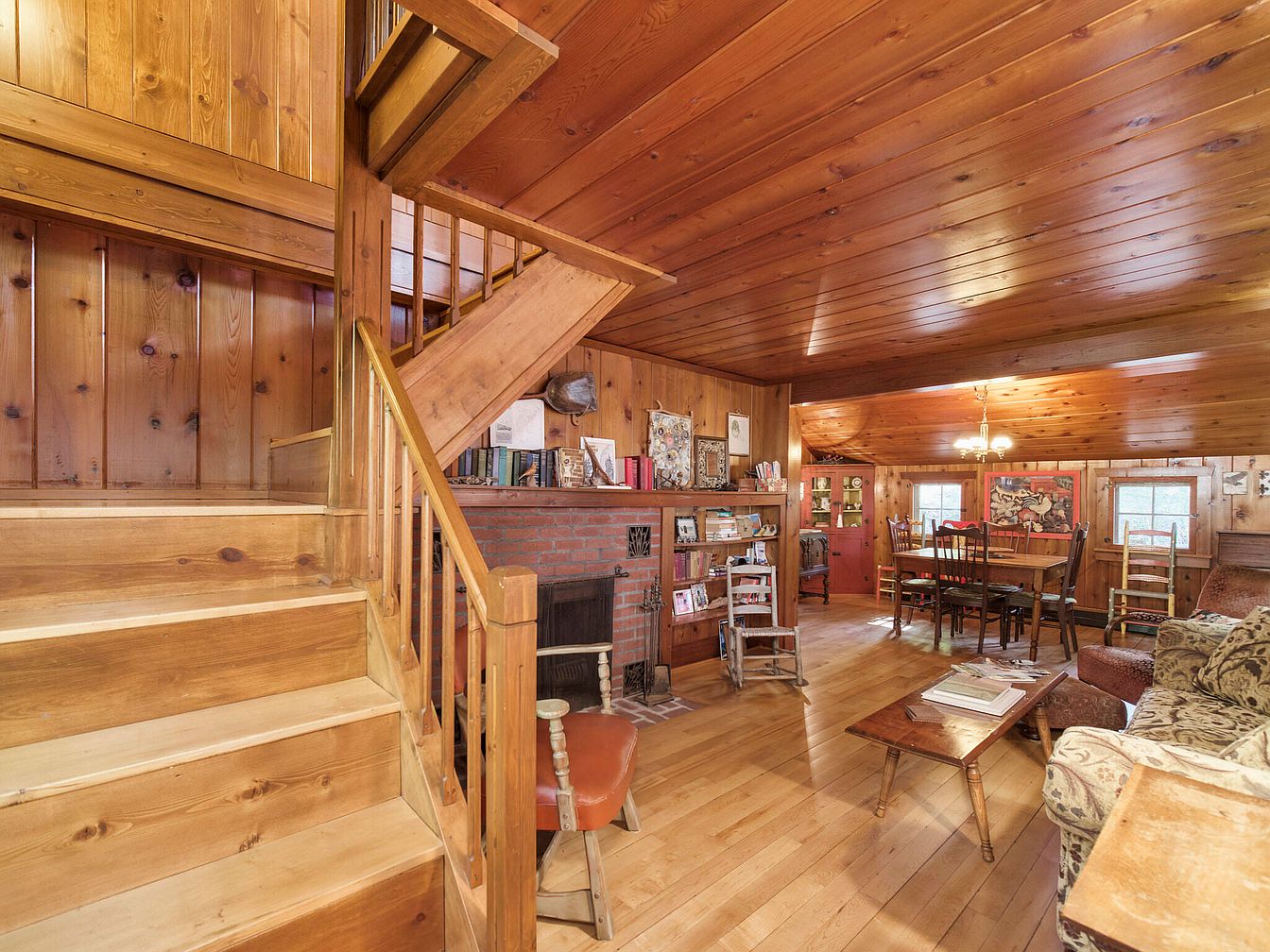 This cozy living area features warm wooden paneling and flooring, enhancing the rustic charm of the space. Light wood tones create a welcoming atmosphere, complemented by a series of comfortable seating options, including a patterned sofa and a wooden armchair. A wooden staircase ascends to the upper level, drawing the eye upwards with its elegant design. Nearby, a dining area is visible, furnished with a sturdy wooden table surrounded by matching chairs. Decorative elements, such as bookshelves and artwork, add personality, while natural light spills in through the windows, providing a bright and inviting ambiance.