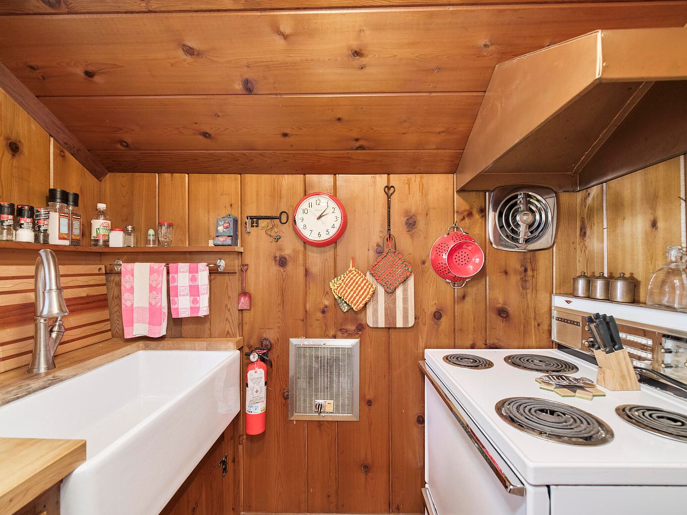 This rustic kitchen showcases warm wooden paneling that enhances its cozy feel. The layout centers around a classic white farmhouse sink with a modern faucet, complemented by a wooden countertop. Above, a copper range hood adds a touch of sophistication against the natural wood backdrop. The stove, a vintage model with coil burners, sits beside neatly organized cookware and utensils in soft metallic tones. Decorative elements include hanging dish towels in pink checks, a vintage clock, and spice jars on a shelf, all contributing color and personality. Wall-mounted accessories, such as pot holders, enrich the homey atmosphere.