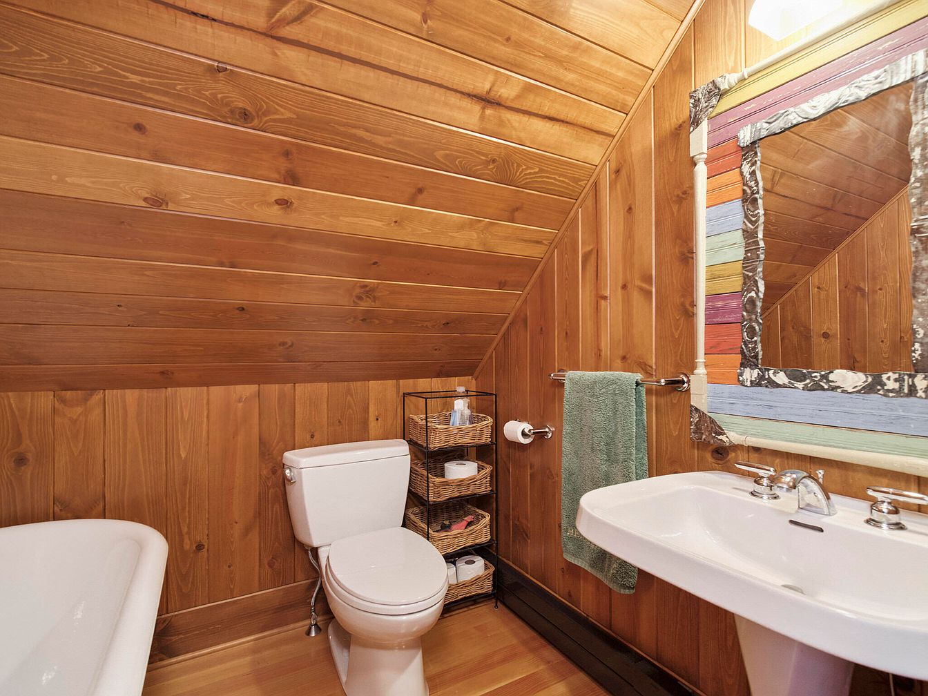 The bathroom features warm wooden paneling that creates a cozy, rustic atmosphere. The slanted ceiling adds depth and intimacy to the space. A classic white clawfoot tub sits alongside a modern toilet, both contrasting beautifully against the wood. A floating sink, mounted against the wall, provides a sleek and versatile look. A colorful, eclectic mirror frame adds a pop of color, enhancing the bathroom’s charm. Metal fixtures, including a towel rack and faucet, contribute to an elegant yet functional aesthetic. A woven basket shelf offers storage, while a green towel introduces a refreshing touch to the earthy color palette.