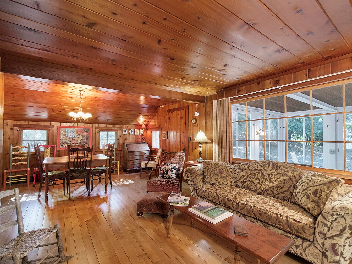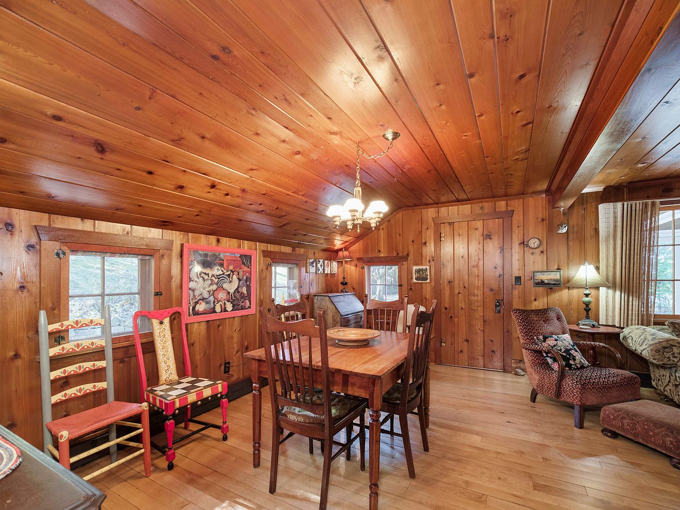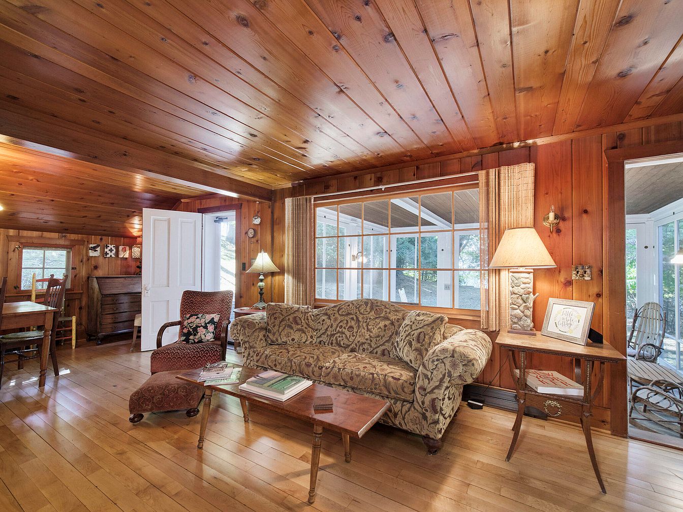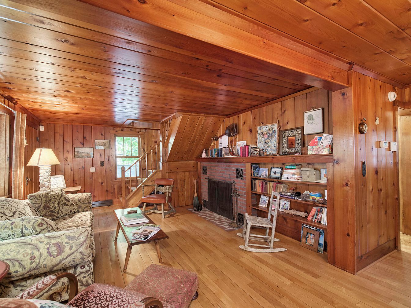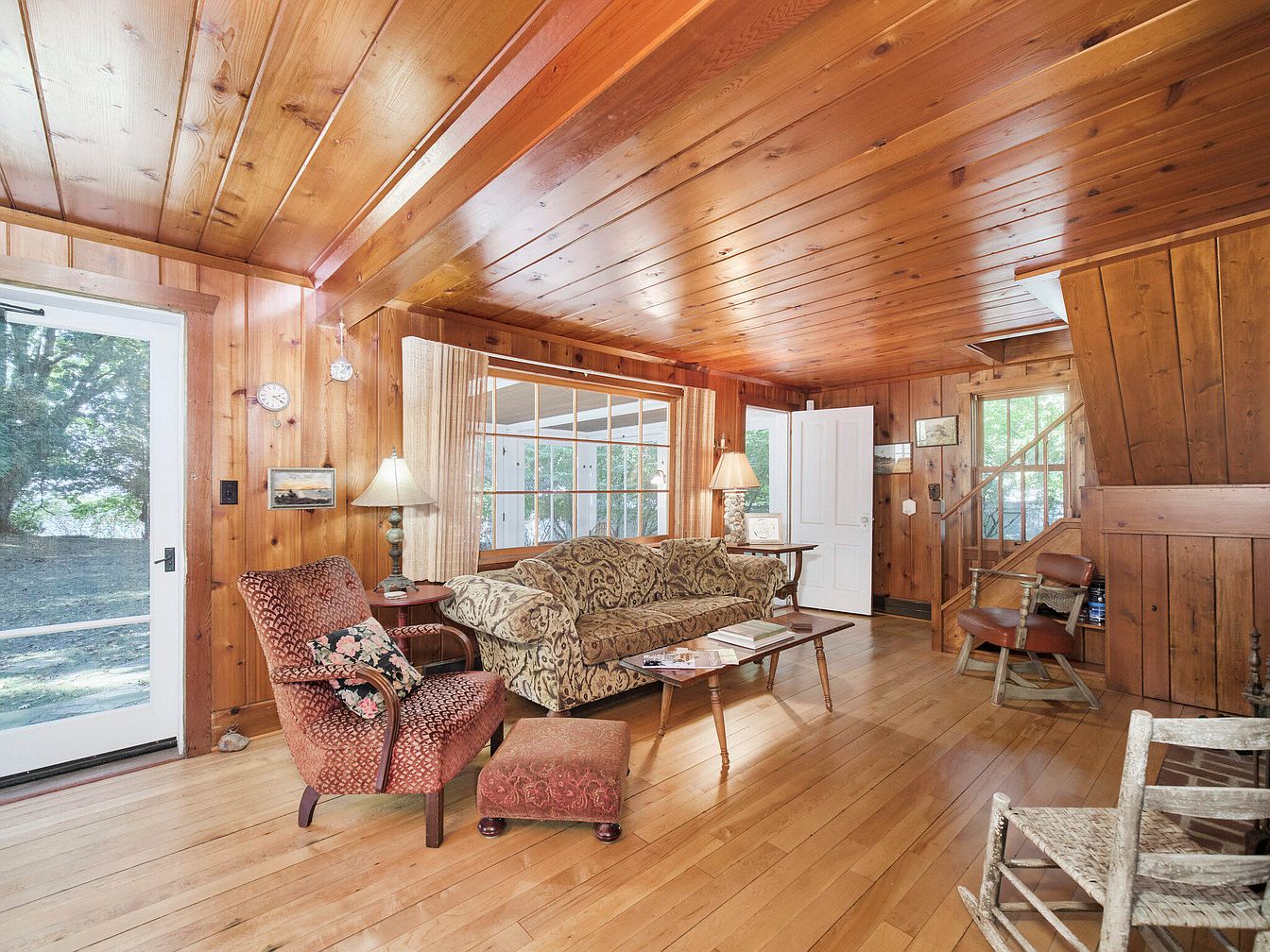 This cozy living room features rich wood paneling on both walls and ceiling, creating a warm, inviting atmosphere. Natural light pours in from multiple windows, illuminating a mix of vintage and comfortable furnishings. The centerpiece is a plush sofa with intricate patterns, complemented by a floral armchair and an ottoman in a matching fabric. A wooden coffee table rests on the polished hardwood floor, adorned with magazines. A stylish table lamp provides soft lighting next to the sofa, while a closed wooden door leads to a staircase. Decorative wall art adds character, enhancing the room’s rustic charm.